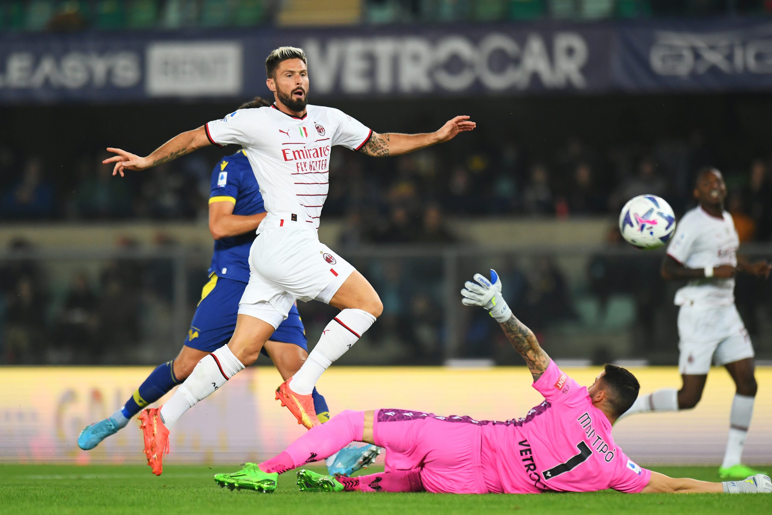VERONA, ITALY - OCTOBER 16: Olivier Giroud of AC Milan shoots and misses as Lorenzo Montipo of Hellas Verona attempts to save during the Serie A match between Hellas Verona and AC MIlan at Stadio Marcantonio Bentegodi on October 16, 2022 in Verona, Italy. (Photo by Alessandro Sabattini/Getty Images)