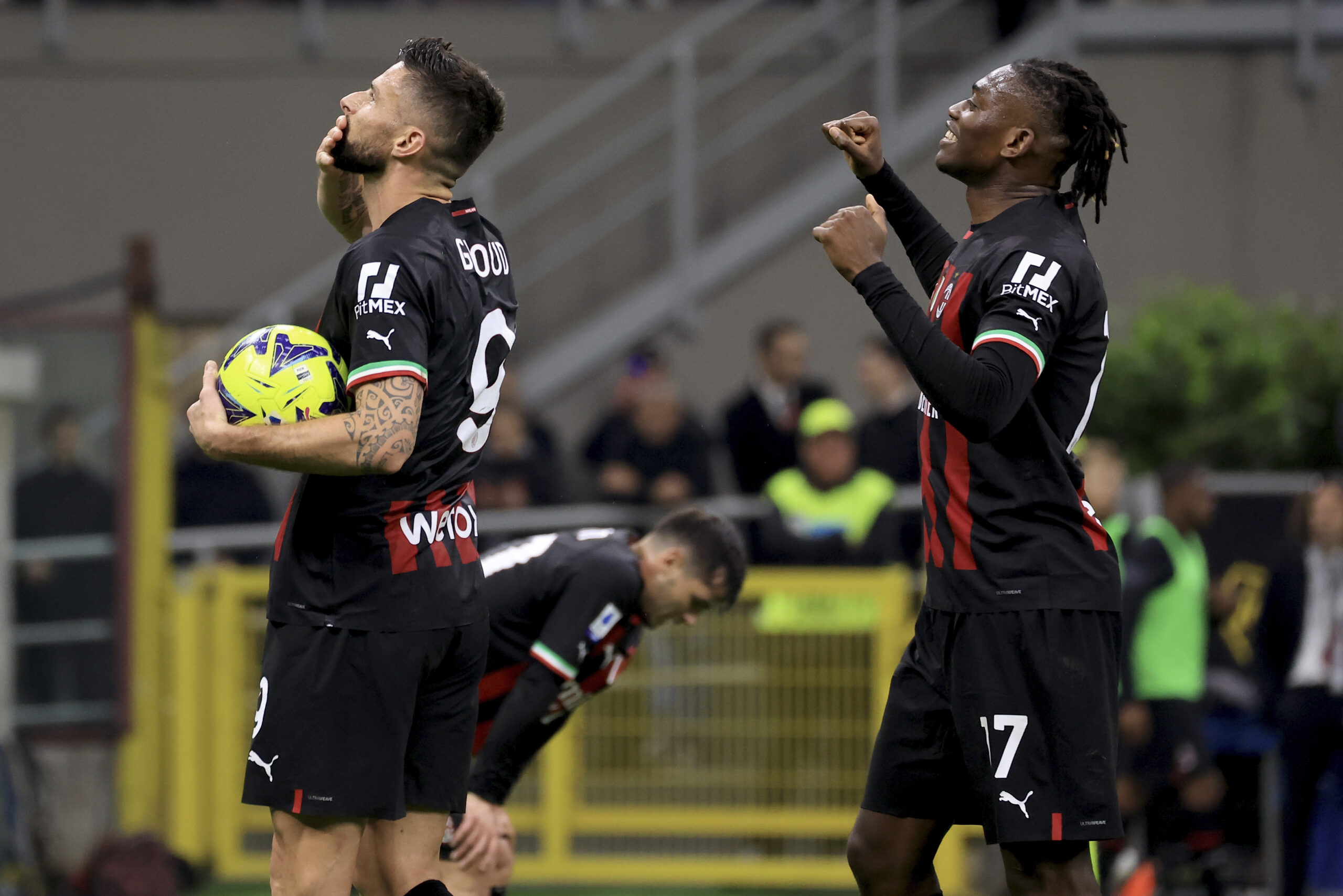 MILAN, ITALY - MAY 20: Olivier Giroud (L) of AC Milan celebrates after scoring his team's fifth goal during the Serie A match between AC Milan and UC Sampdoria at Stadio Giuseppe Meazza on May 20, 2023 in MILAN, ITALY. (Photo by Giuseppe Cottini/AC Milan via Getty Images)