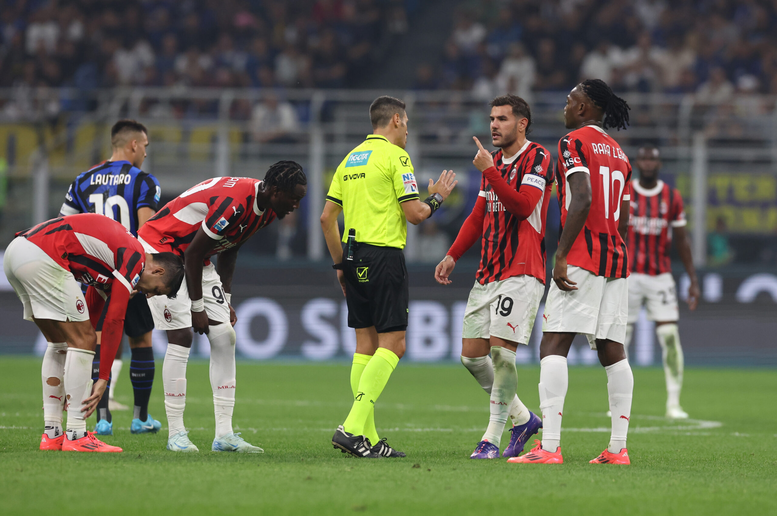 MILAN, ITALY - SEPTEMBER 22: Theo Hernandez of AC Milan reacts with referee during the Serie A match between Inter and Milan at Stadio Giuseppe Meazza on September 22, 2024 in Milan, Italy. (Photo by Claudio Villa/AC Milan via Getty Images)