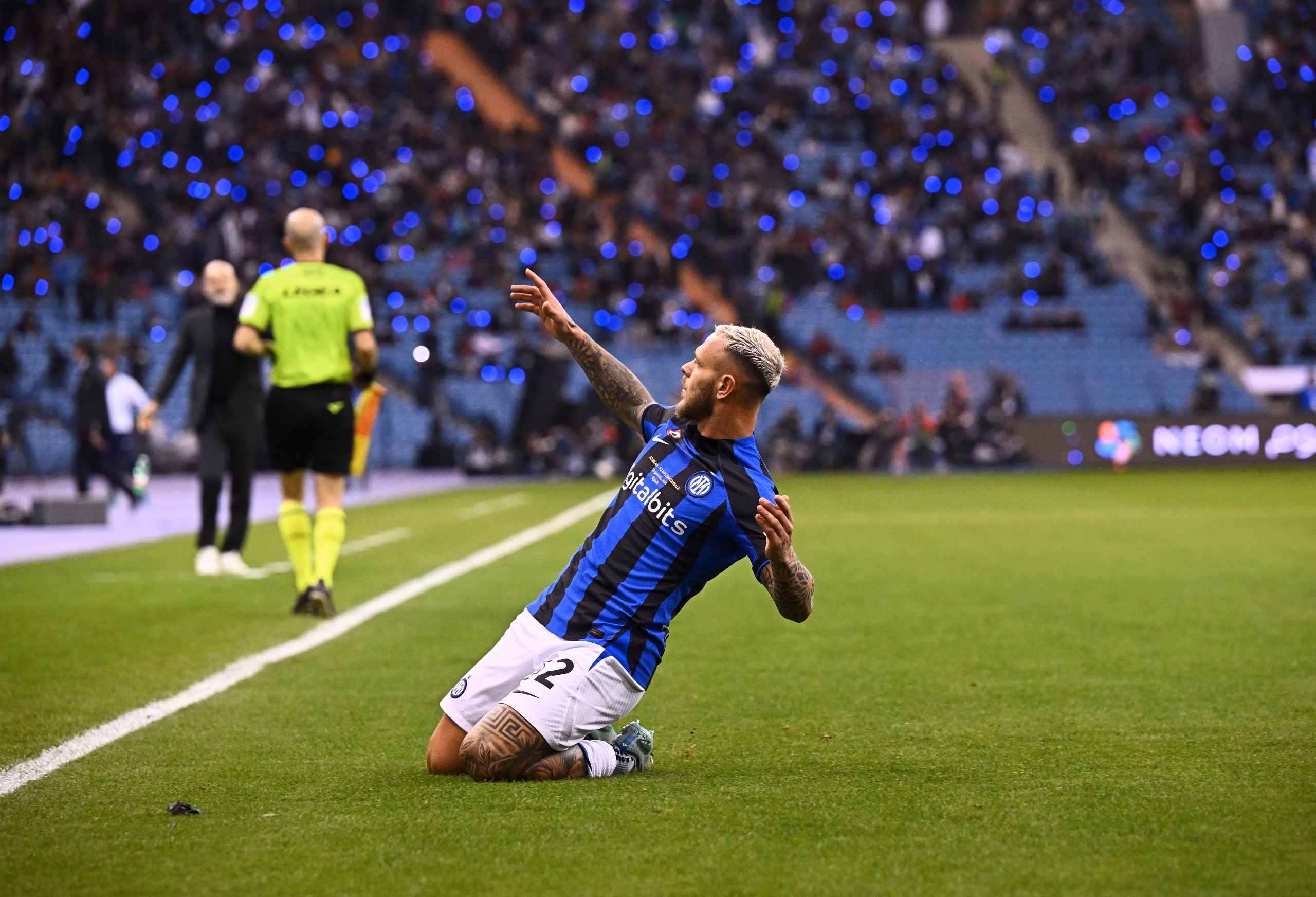 RIYADH, SAUDI ARABIA - JANUARY 18: Federico Dimarco of FC Internazionale celebrates after scoring their team's first goal during EA Sports Supercup match between AC Milan and FC Internazionale at King Fahd International Stadium on January 18, 2023 in Riyadh, Saudi Arabia. (Photo by Mattia Ozbot - Inter/Inter via Getty Images)