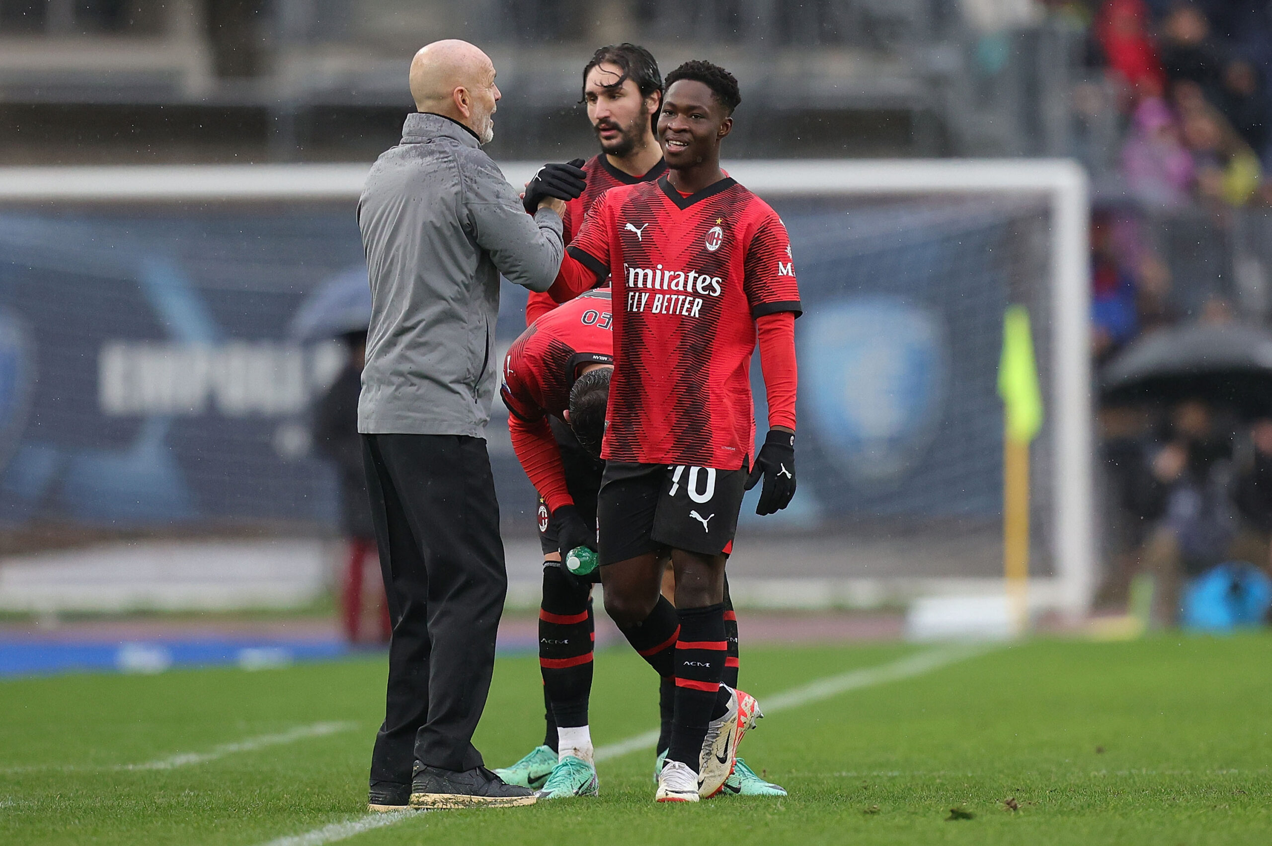 EMPOLI, ITALY - JANUARY 7: Stefano Pioli manager of AC Milan and Chaka Taore' of AC Milan during the Serie A TIM match between Empoli FC and AC Milan at Stadio Carlo Castellani on January 7, 2024 in Empoli, Italy. (Photo by Gabriele Maltinti/Getty Images)