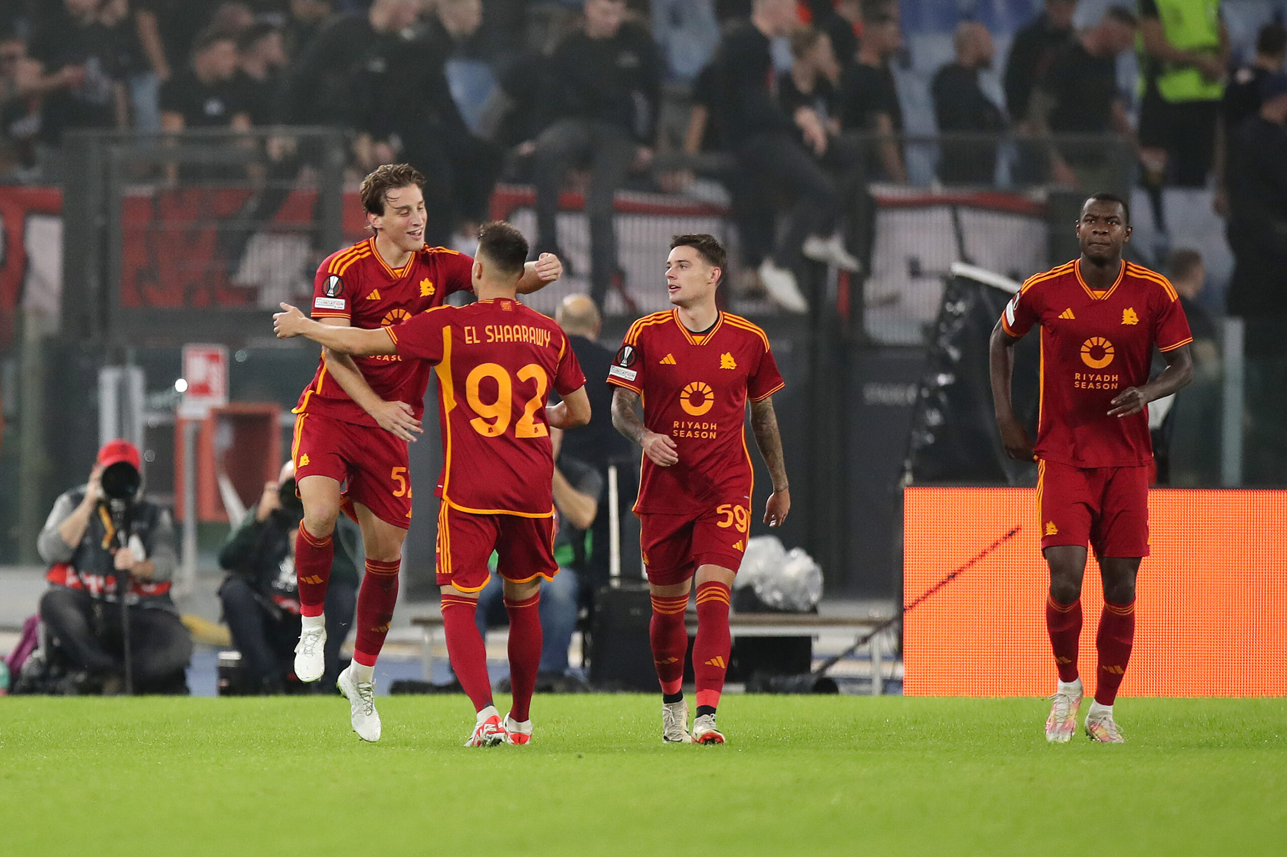 ROME, ITALY - OCTOBER 26: Edoardo Bove of AS Roma celebrates with Stephan El Shaarawy of AS Roma after scoring the team's first goal during the UEFA Europa League 2023/24 match between AS Roma and SK Slavia Praha at Stadio Olimpico on October 26, 2023 in Rome, Italy. (Photo by Paolo Bruno/Getty Images)