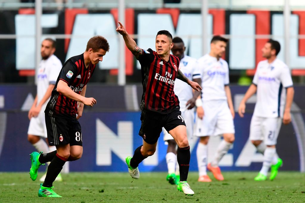 AC Milan Italian forward Gianluca Lapadula (C) celebrates after scoring during the Italian Serie A football match AC Milan vs Empoli at the San Siro stadium in Milan on April 23, 2017. / AFP PHOTO / MIGUEL MEDINA (Photo credit should read MIGUEL MEDINA/AFP/Getty Images)