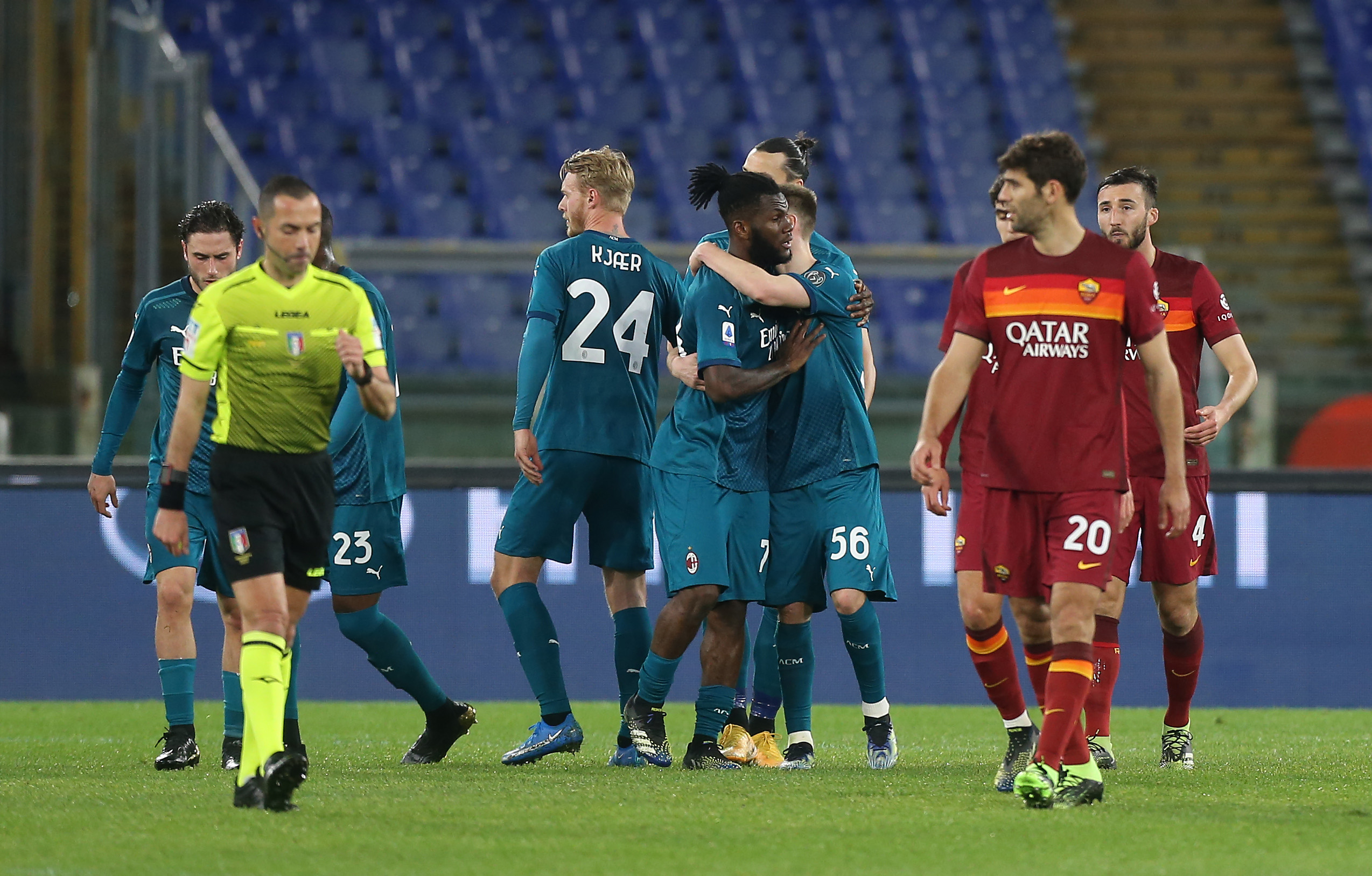 Fazio protesta con l'arbitro Guida mentre il Milan esulta per il goal segnato da Kessie su rigore