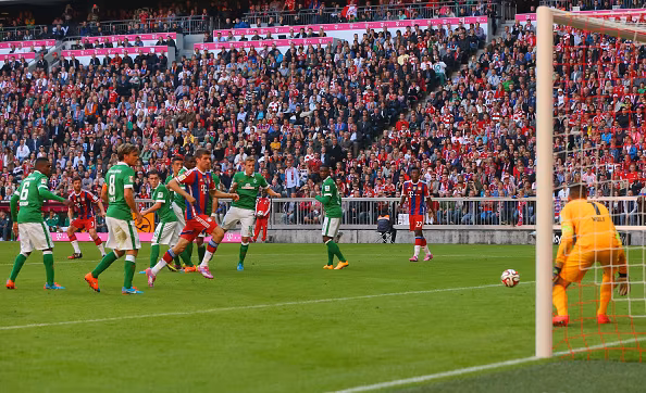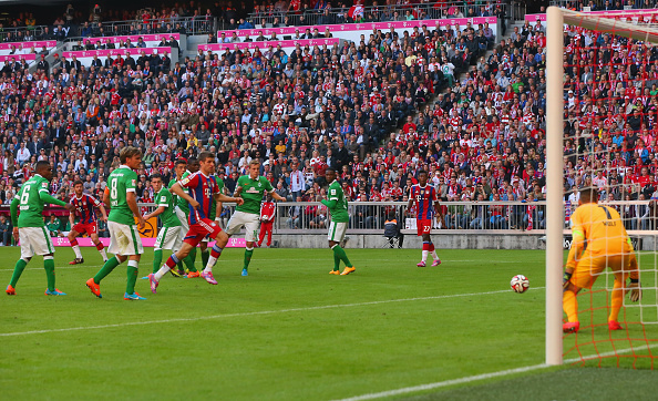 MUNICH, GERMANY - OCTOBER 18: Xabi Alonso of Bayern Muenchen scores their second goal during the Bundesliga match between FC Bayern Muenchen and SV Werder Bremen at Allianz Arena on October 18, 2014 in Munich, Germany. (Photo by Alexander Hassenstein/Bongarts/Getty Images)