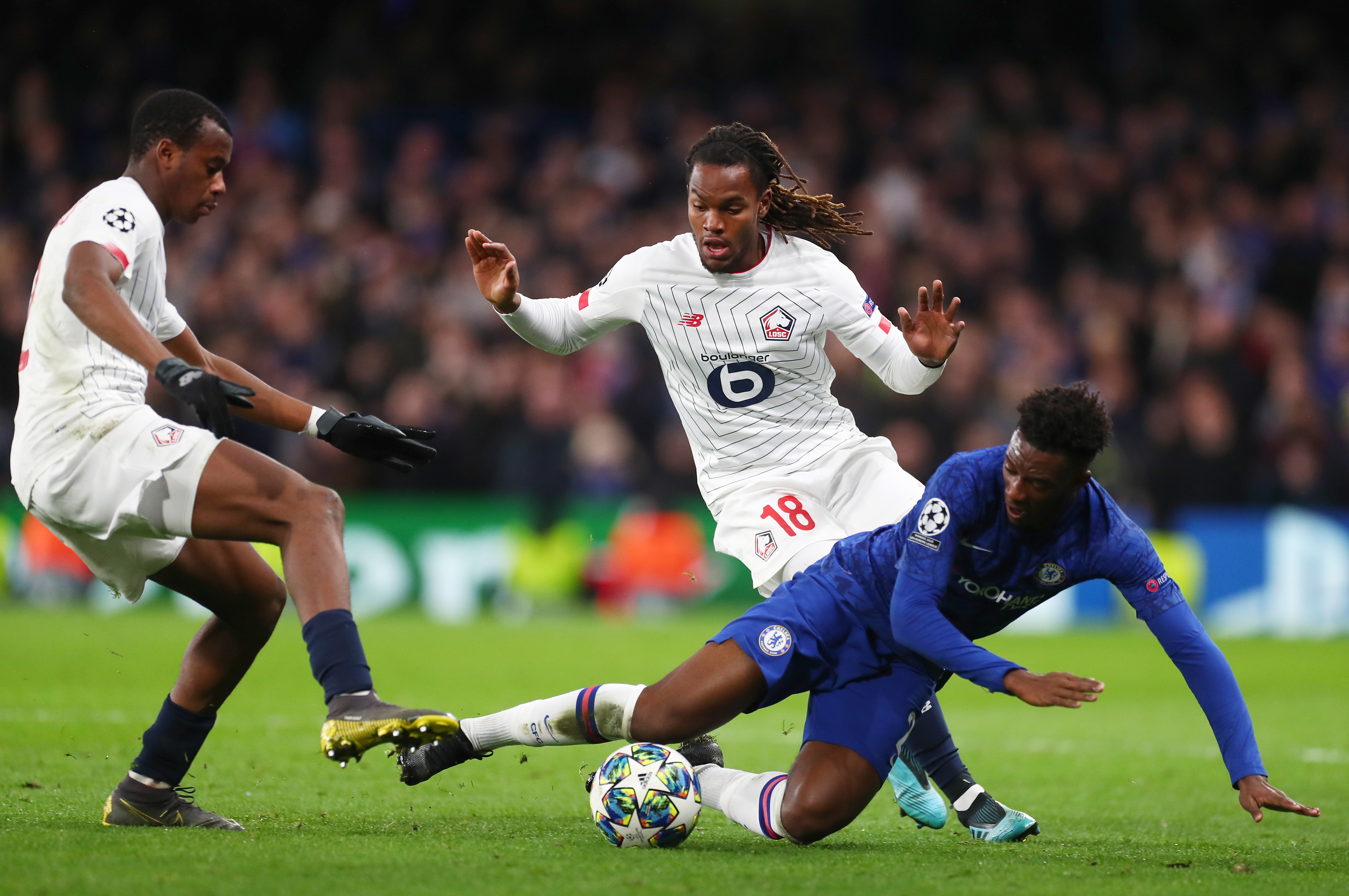LONDON, ENGLAND - DECEMBER 10: Callum Hudson-Odoi of Chelsea is tackled by Renato Sanches of Lille during the UEFA Champions League group H match between Chelsea FC and Lille OSC at Stamford Bridge on December 10, 2019 in London, United Kingdom. (Photo by Clive Rose/Getty Images)
