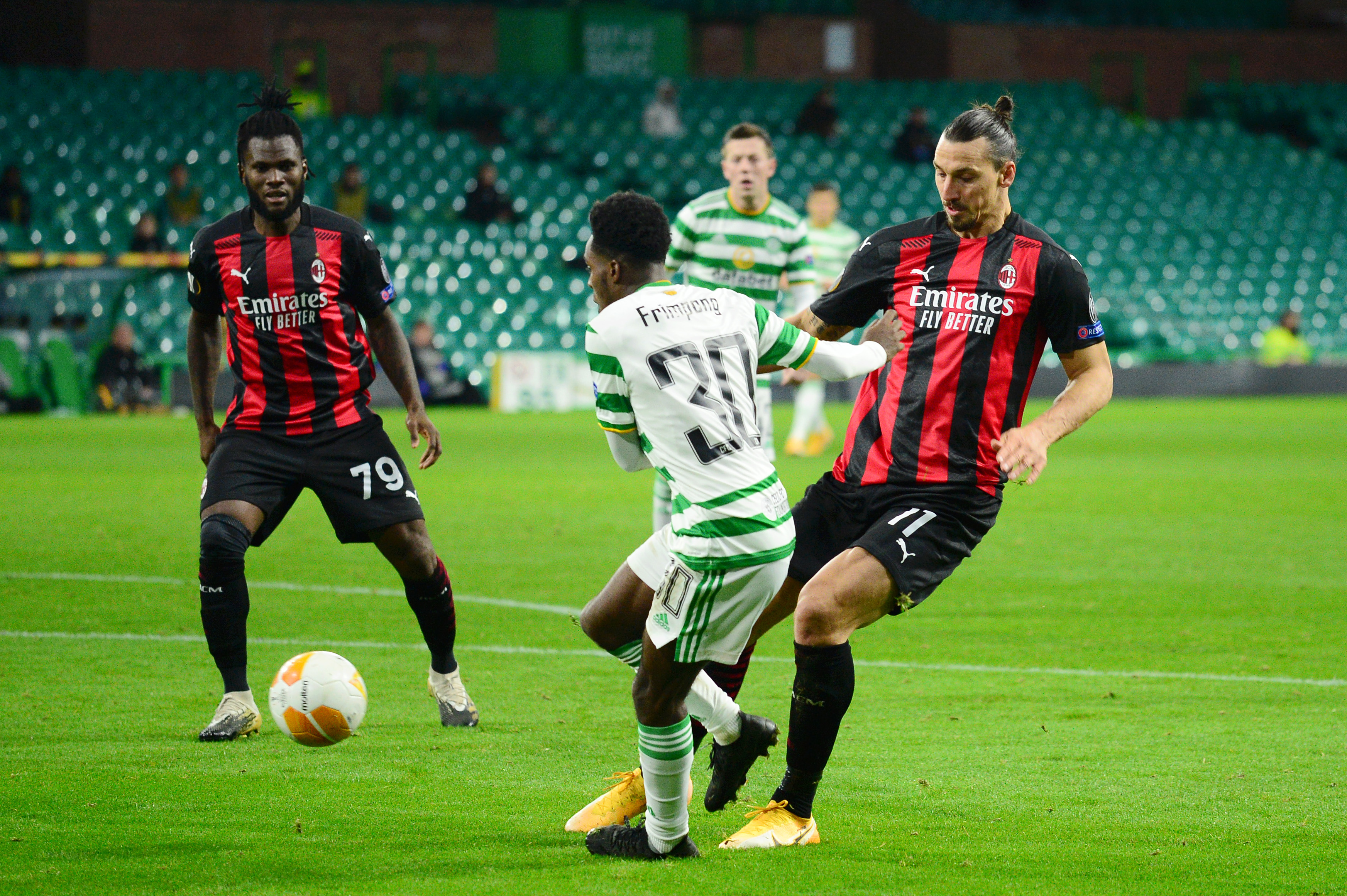 GLASGOW, SCOTLAND - OCTOBER 22: Jeremie Frimpong of Celtic is challenged by Zlatan Ibrahimovic of AC Milan during the UEFA Europa League Group H stage match between Celtic and AC Milan at Celtic Park on October 22, 2020 in Glasgow, Scotland. Sporting stadiums around the UK remain under strict restrictions due to the Coronavirus Pandemic as Government social distancing laws prohibit fans inside venues resulting in games being played behind closed doors. (Photo by Mark Runnacles/Getty Images)