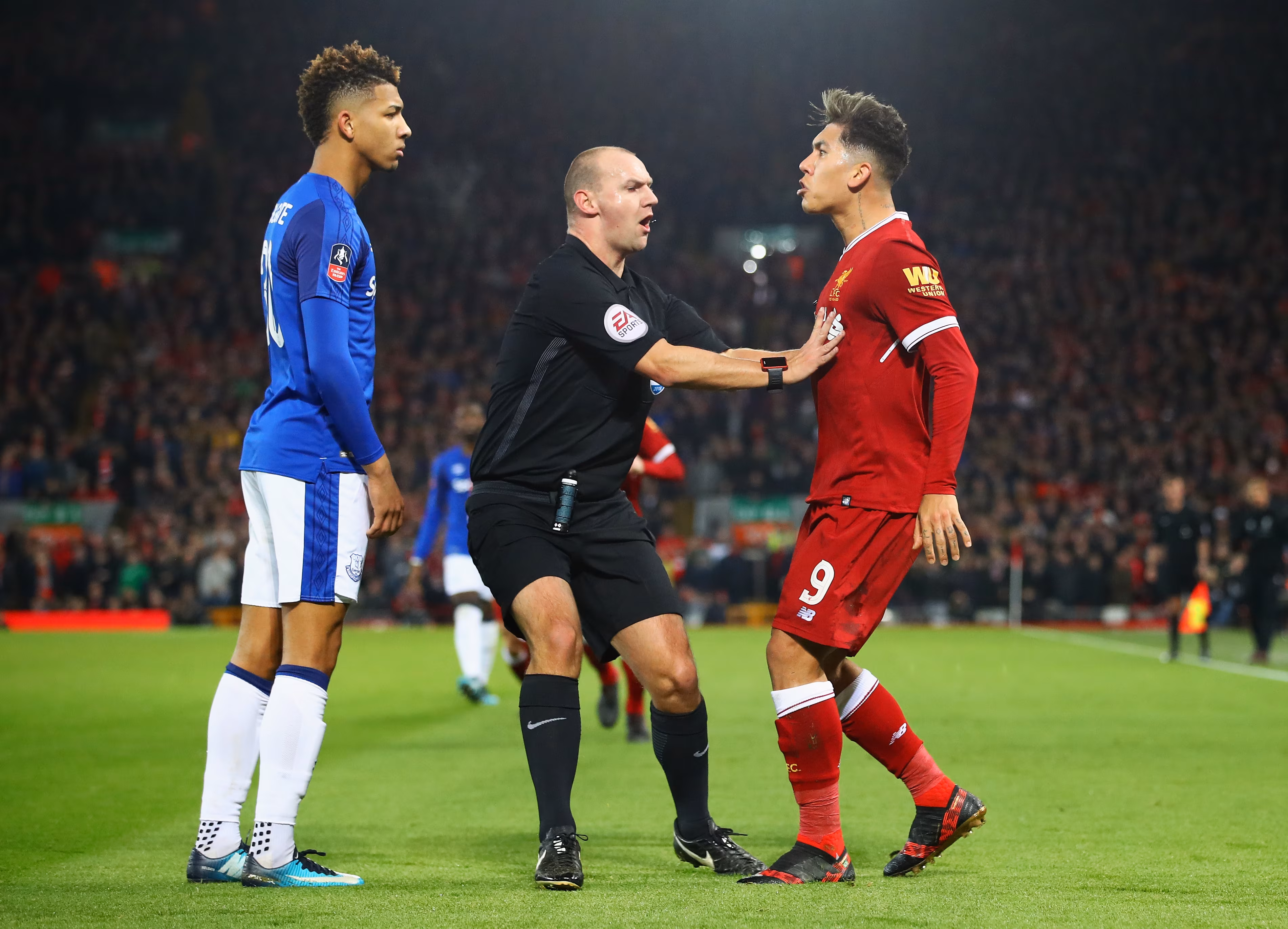 LIVERPOOL, ENGLAND - JANUARY 05: Referee Robert Madley intervenes as Mason Holgate of Everton and Roberto Firmino of Liverpool clash during the Emirates FA Cup Third Round match between Liverpool and Everton at Anfield on January 5, 2018 in Liverpool, England. (Photo by Clive Brunskill/Getty Images)