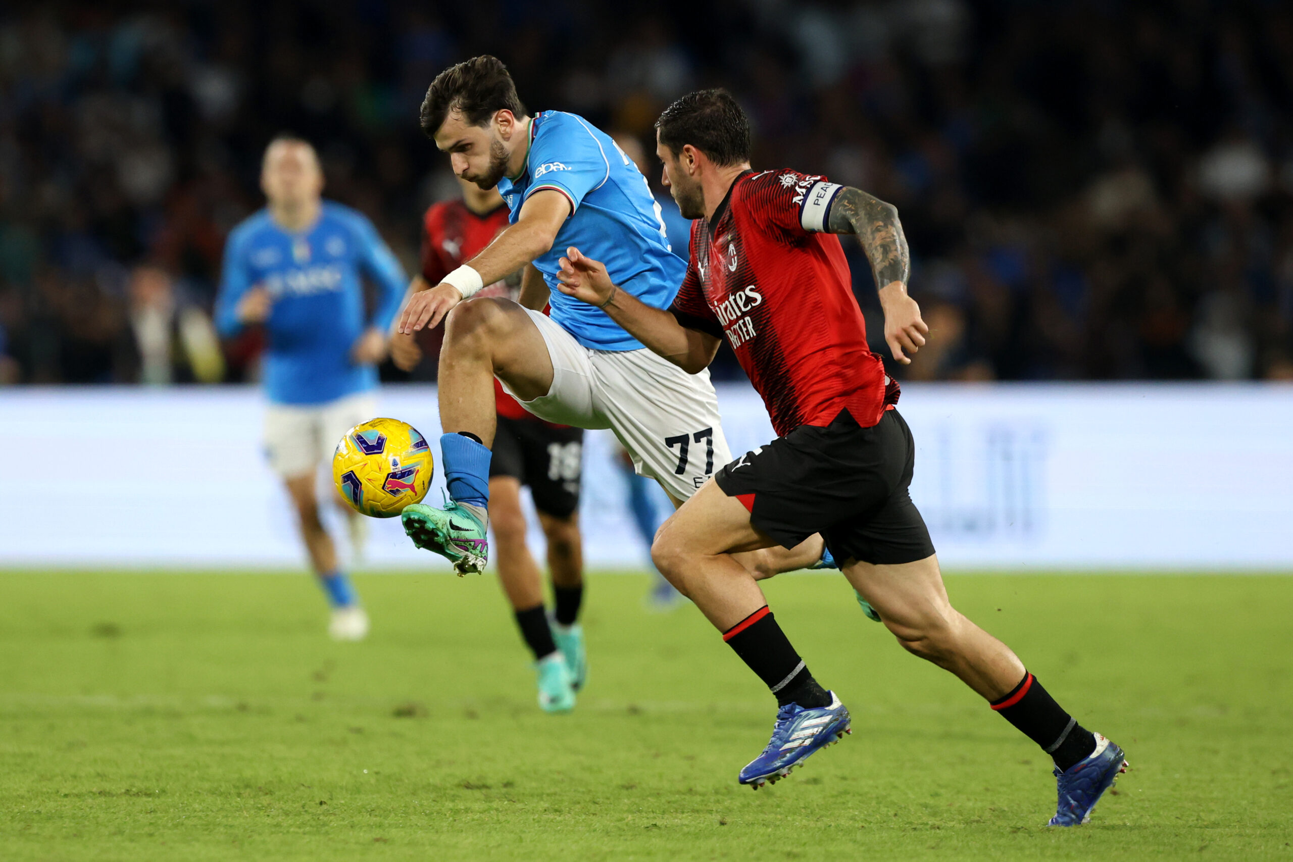 NAPLES, ITALY - OCTOBER 29: Khvicha Kvaratskhelia of SSC Napoli controls the ball whilst under pressure from Davide Calabria of AC Milan during the Serie A TIM match between SSC Napoli and AC Milan at Stadio Diego Armando Maradona on October 29, 2023 in Naples, Italy. (Photo by Francesco Pecoraro/Getty Images)