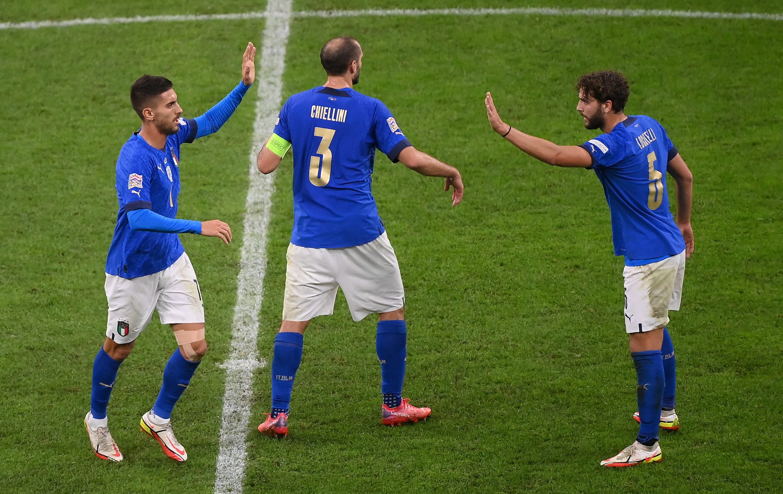 Pellegrini, Chiellini e Locatelli con la maglia della Nazionale italiana.