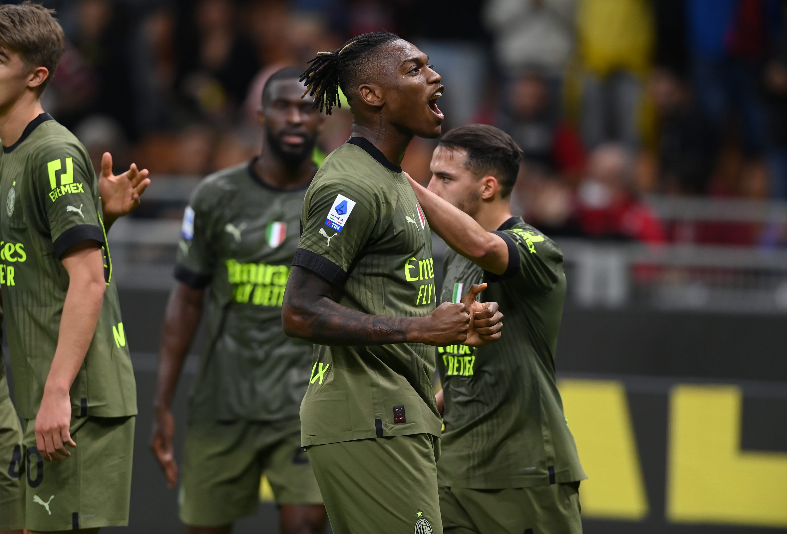 MILAN, ITALY - OCTOBER 22: Rafael Leao of AC Milan celebrates after scoring the goal during the Serie A match between AC Milan and AC Monza at Stadio Giuseppe Meazza on October 22, 2022 in Milan, Italy . (Photo by Claudio Villa/AC Milan via Getty Images)