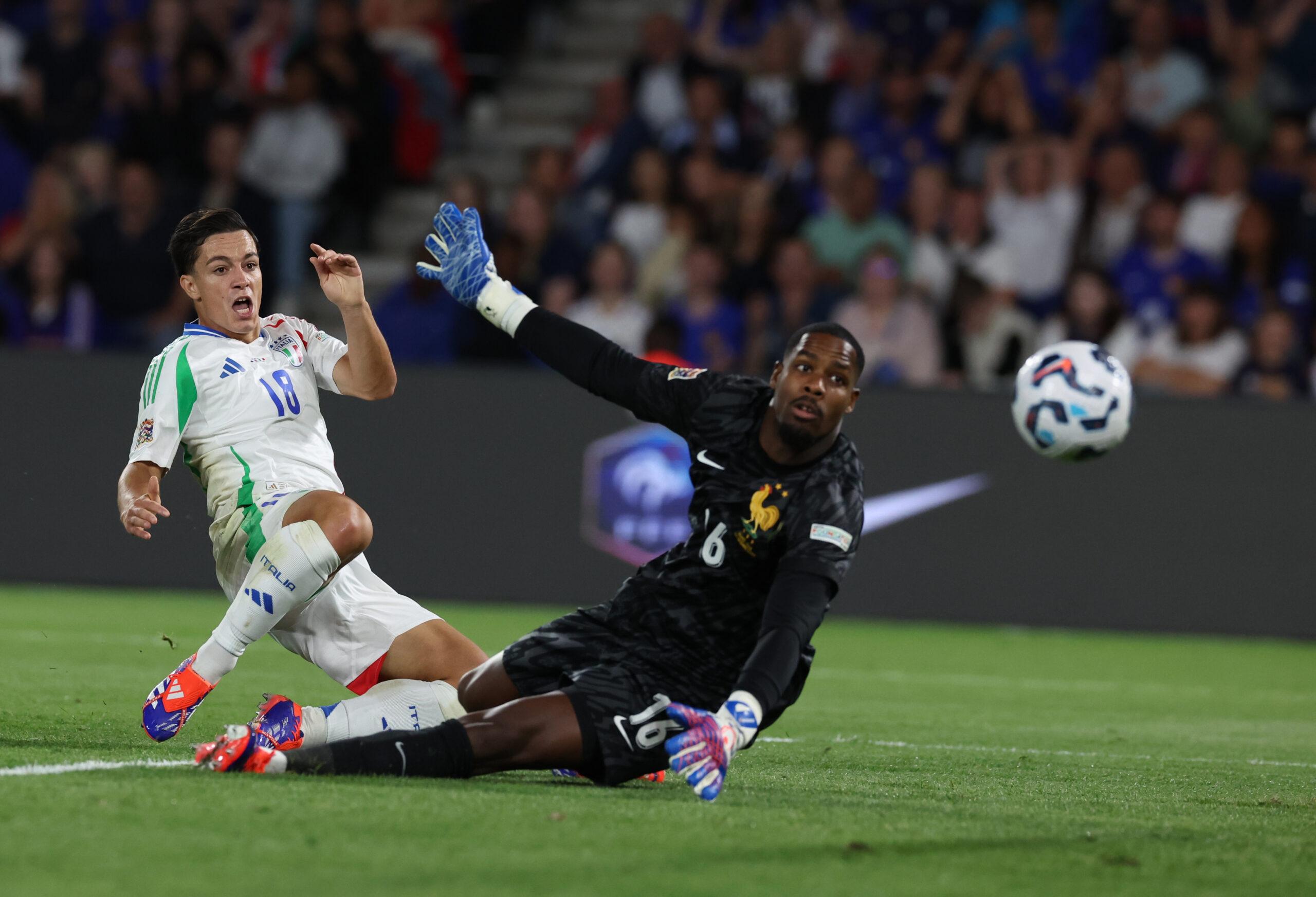 PARIS, FRANCE - SEPTEMBER 06: Giacomo Raspador of Italy scores the goal during the UEFA Nations League 2024/25 League A Group A2 match between France and Italy at Parc des Princes stadium on September 06, 2024 in Paris, France. (Photo by Claudio Villa/Getty Images)
