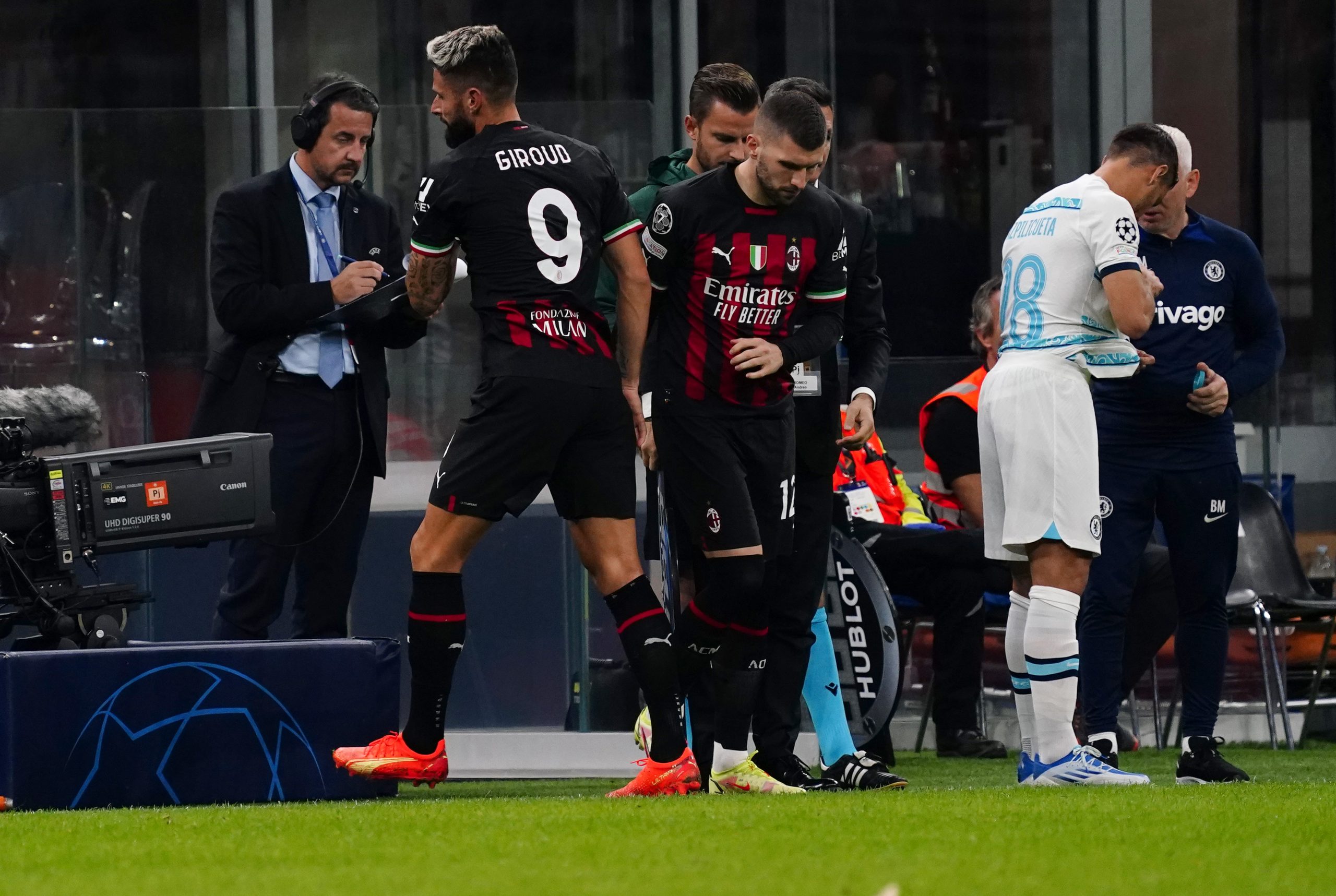 MILAN, ITALY - OCTOBER 11: Olivier Giroud of AC Milan leaves the field and cheers Ante Rebić of AC Milan during the UEFA Champions League group E match between AC Milan and Chelsea FC at Giuseppe Meazza Stadium on October 11, 2022 in Milan, Italy. (Photo by Pier Marco Tacca/AC Milan via Getty Images)