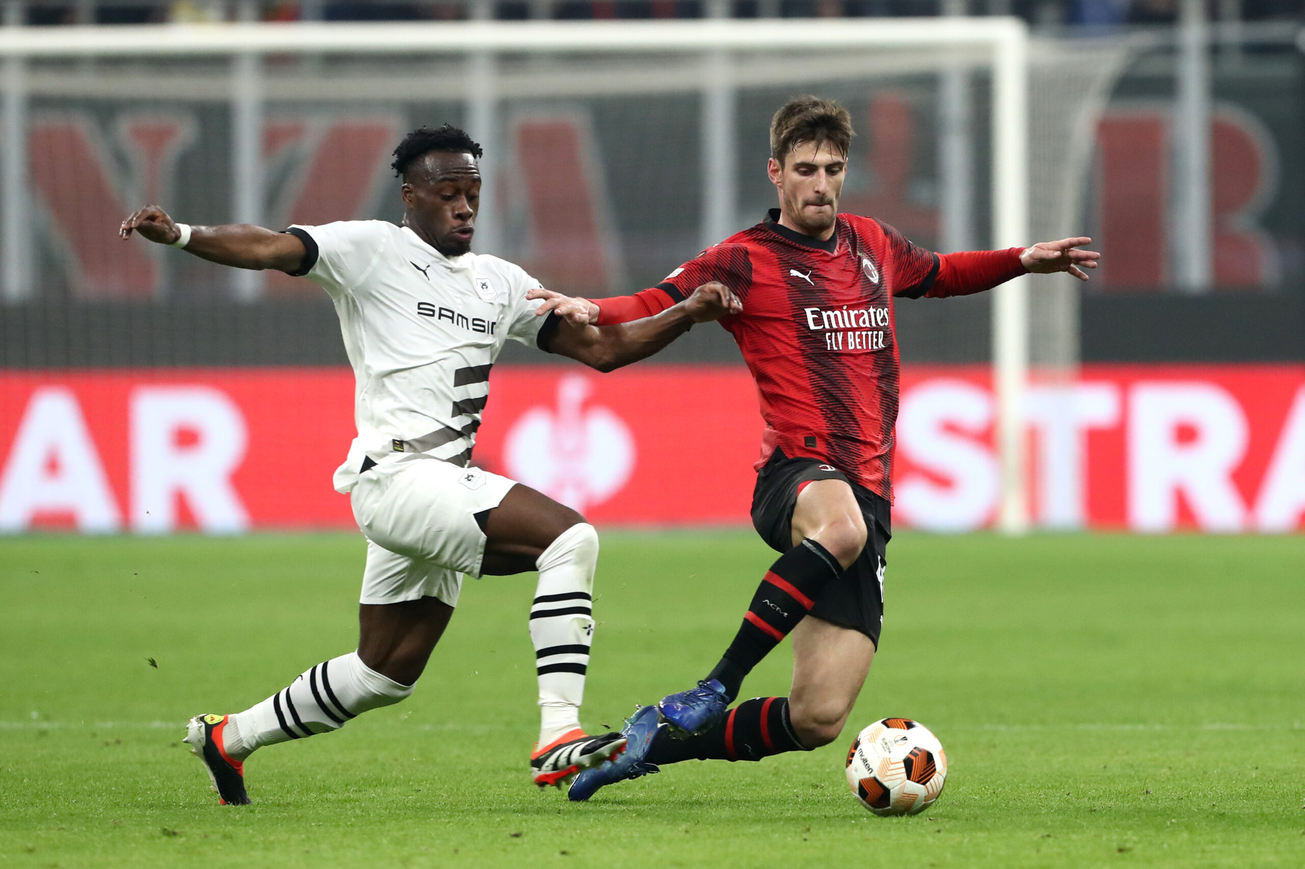 MILAN, ITALY - FEBRUARY 15: Matteo Gabbia of AC Milan is challenged by Arnaud Kalimuendo of Stade Rennais during the UEFA Europa League 2023/24 Playoff First Leg match between AC Milan and Stade Rennais FC at Stadio Giuseppe Meazza on February 15, 2024 in Milan, Italy. (Photo by Marco Luzzani/Getty Images)