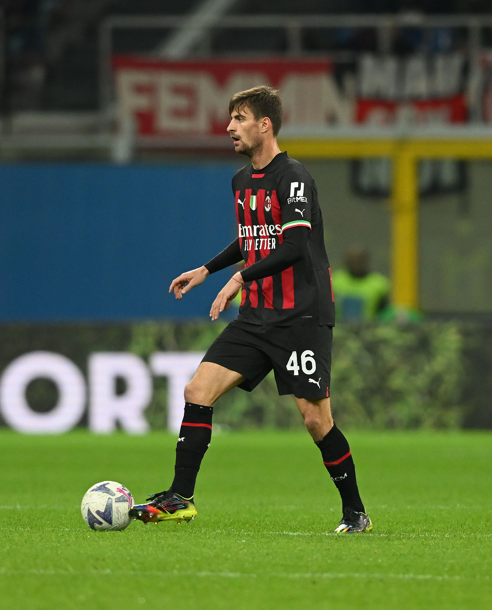 MILAN, ITALY - NOVEMBER 05: Matteo Gabbia of AC Milan in action during the Serie A match between AC MIlan and Spezia Calcio at Stadio Giuseppe Meazza on November 05, 2022 in Milan, Italy. (Photo by Claudio Villa/AC Milan via Getty Images)