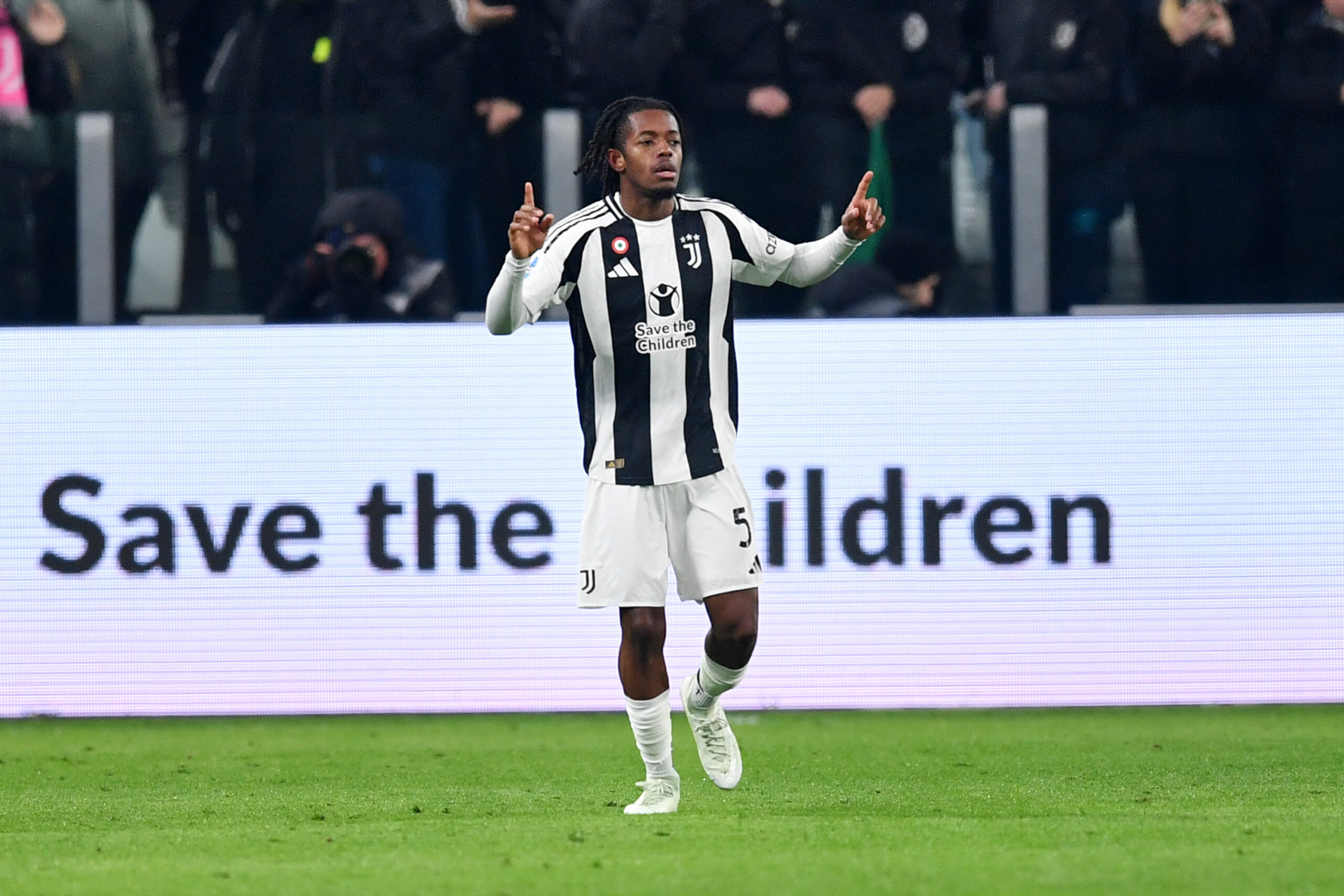 TURIN, ITALY - JANUARY 18: Samuel Mbangula of Juventus celebrates scoring his team's first goal during the Serie A match between Juventus and AC Milan at Allianz Stadium on January 18, 2025 in Turin, Italy. (Photo by Valerio Pennicino/Getty Images)