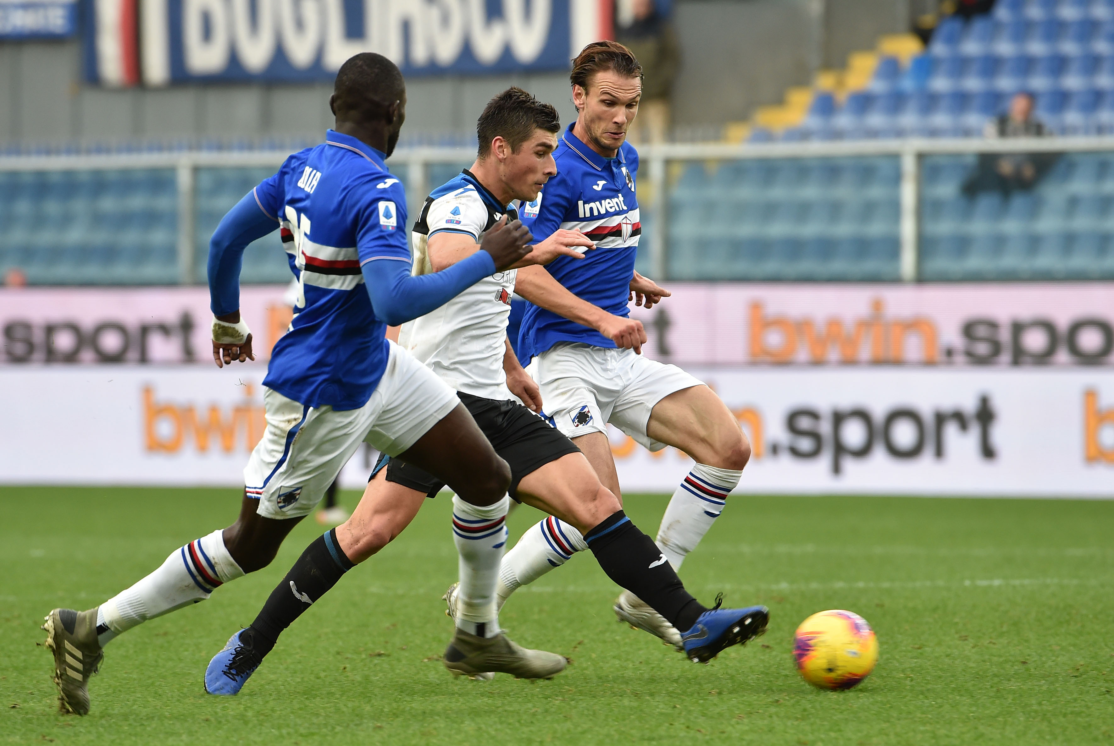 GENOA, ITALY - NOVEMBER 10: Ruslan Malinovskyj of Atalanta BC with Albin Ekdal and Omar Colley of UC Sampdoria during the Serie A match between UC Sampdoria and Atalanta BC at Stadio Luigi Ferraris on November 10, 2019 in Genoa, Italy. (Photo by Paolo Rattini/Getty Images)