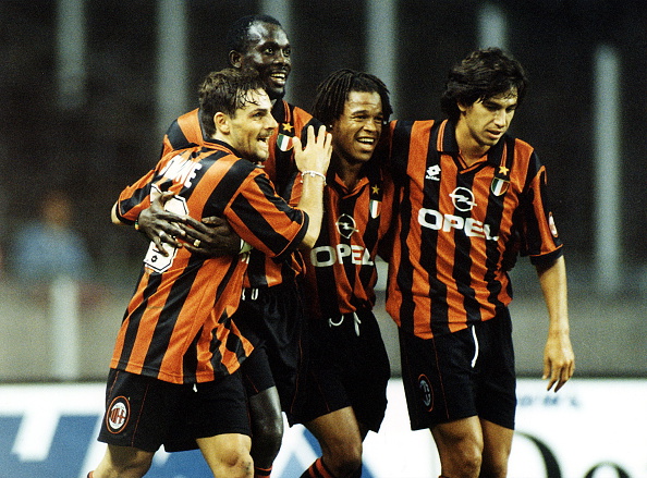 (GERMANY OUT) Sportler, Fussball LB (AC Mailand)Kurzturnier im Berliner Olympiastadion,Bayern München - AC Milan- Jubel der Milan-Spieler v.l.: Simone,Weah, Edgar Davids, Albertini (Photo by Horizont/ullstein bild via Getty Images)