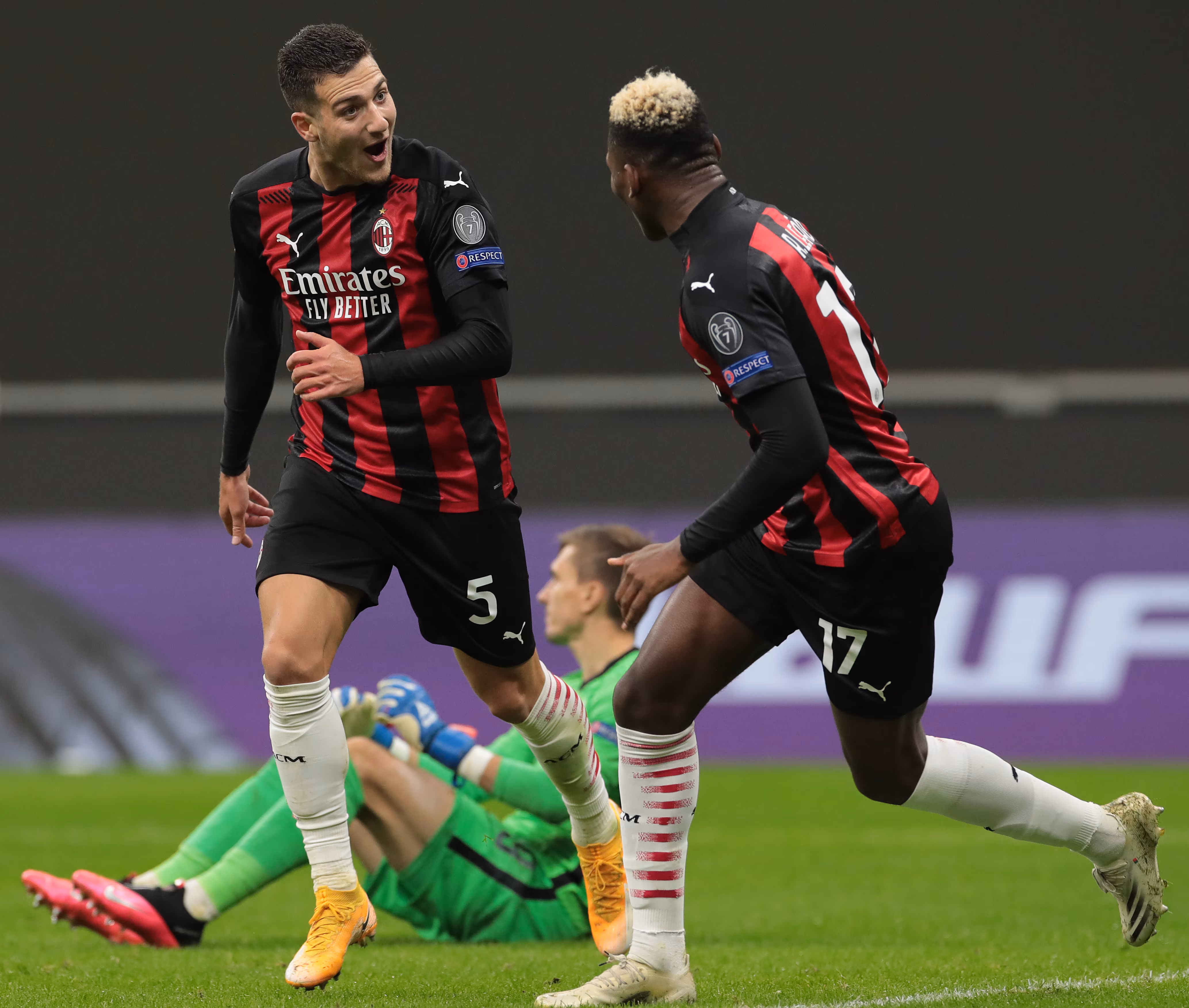 MILAN, ITALY - OCTOBER 29: Diogo Dalot of AC Milan celebrates after scoring the third goal of his team with his team-mate Rafael Leao during the UEFA Europa League Group H stage match between AC Milan and AC Sparta Praha at San Siro Stadium on October 29, 2020 in Milan, Italy. (Photo by Emilio Andreoli/Getty Images)