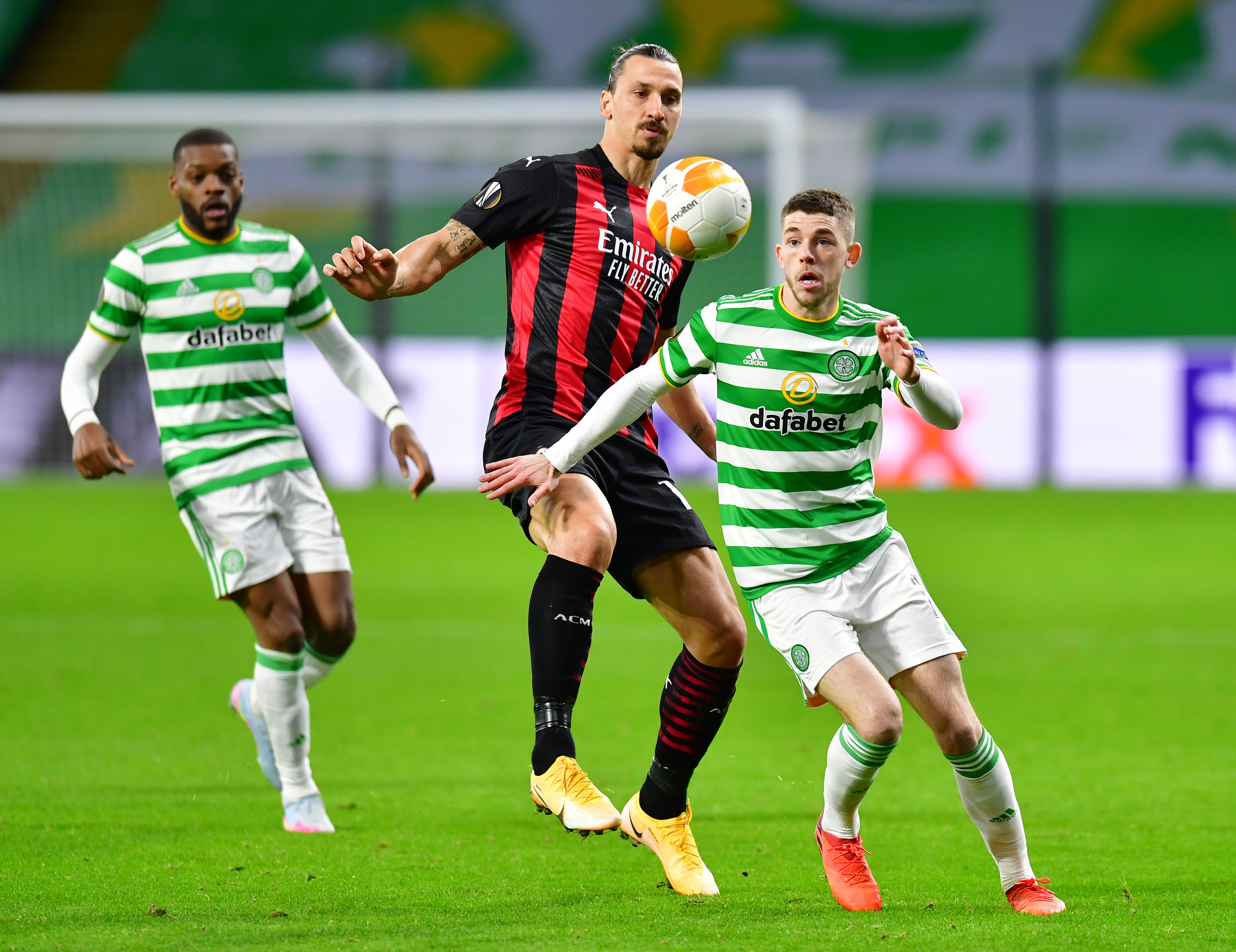 GLASGOW, SCOTLAND - OCTOBER 22: Ryan Christie of Celtic looks to break past Zlatan Ibrahimovic of AC Milan during the UEFA Europa League Group H stage match between Celtic and AC Milan at Celtic Park on October 22, 2020 in Glasgow, Scotland. Sporting stadiums around the UK remain under strict restrictions due to the Coronavirus Pandemic as Government social distancing laws prohibit fans inside venues resulting in games being played behind closed doors. (Photo by Mark Runnacles/Getty Images)