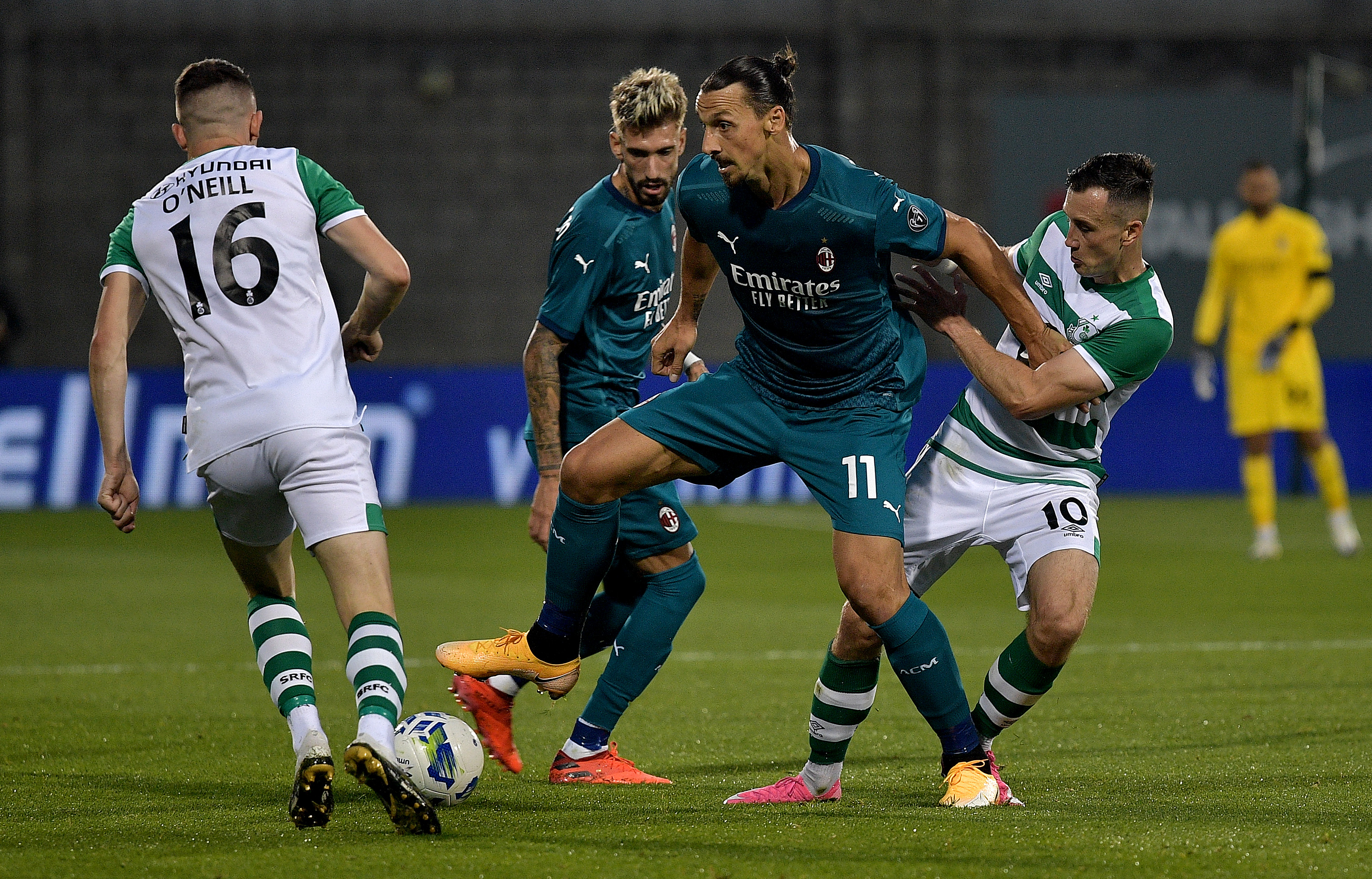 TALLAGHT, IRELAND - SEPTEMBER 17: Zlatan Ibrahimovic of AC Milan battles for possession with Gary O'Neil and Aaron McEneff of Shamrock Rovers during the UEFA Europa League second qualifying round match between Shamrock Rovers and AC Milan at Tallaght Stadium on September 17, 2020 in Tallaght, Ireland. (Photo by Charles McQuillan/Getty Images)