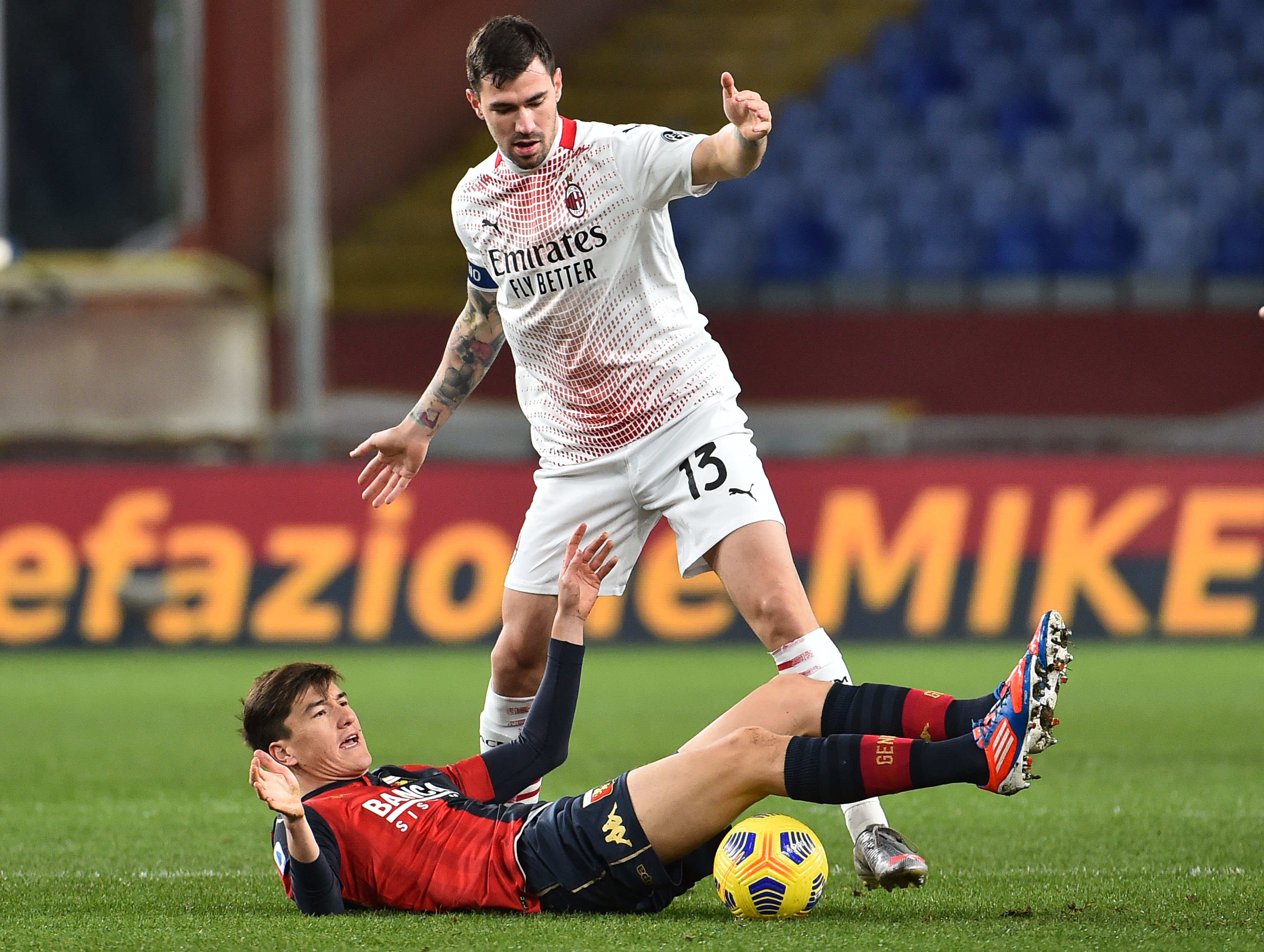 GENOA, ITALY - DECEMBER 16: Ante Rebic of AC Milan opposed to Eldor Shomurodov of Genoa CFC during the Serie A match between Genoa CFC and AC Milan at Stadio Luigi Ferraris on December 16, 2020 in Genoa, Italy. (Photo by Paolo Rattini/Getty Images)