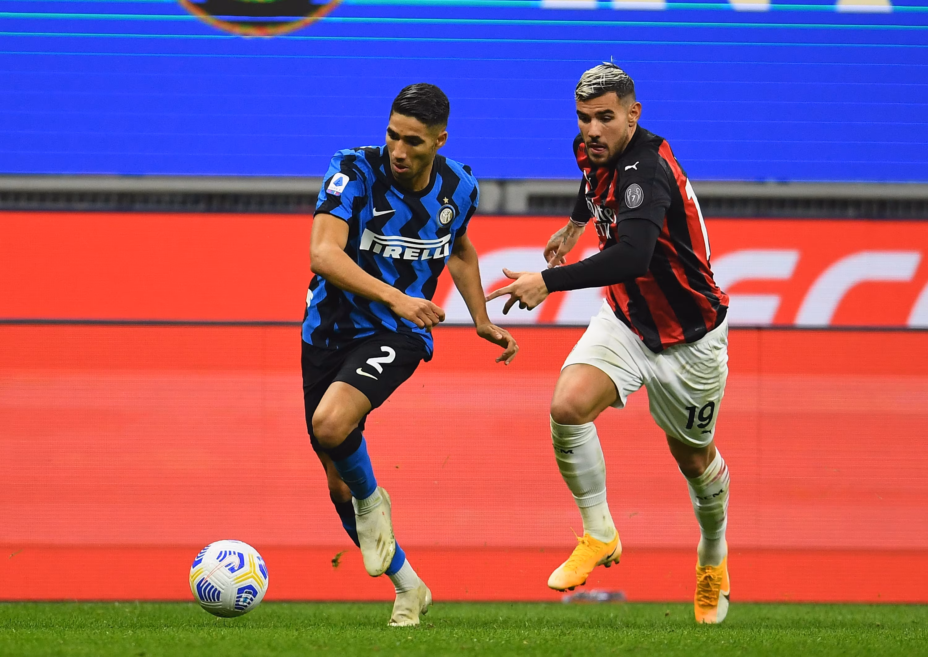 MILAN, ITALY - OCTOBER 17: Achraf Hakimi of FC Internazionale competes for the ball with Theo Hernandez of AC Milan during the Serie A match between FC Internazionale and AC Milan at Stadio Giuseppe Meazza on October 17, 2020 in Milan, Italy. (Photo by Claudio Villa - Inter/Inter via Getty Images)