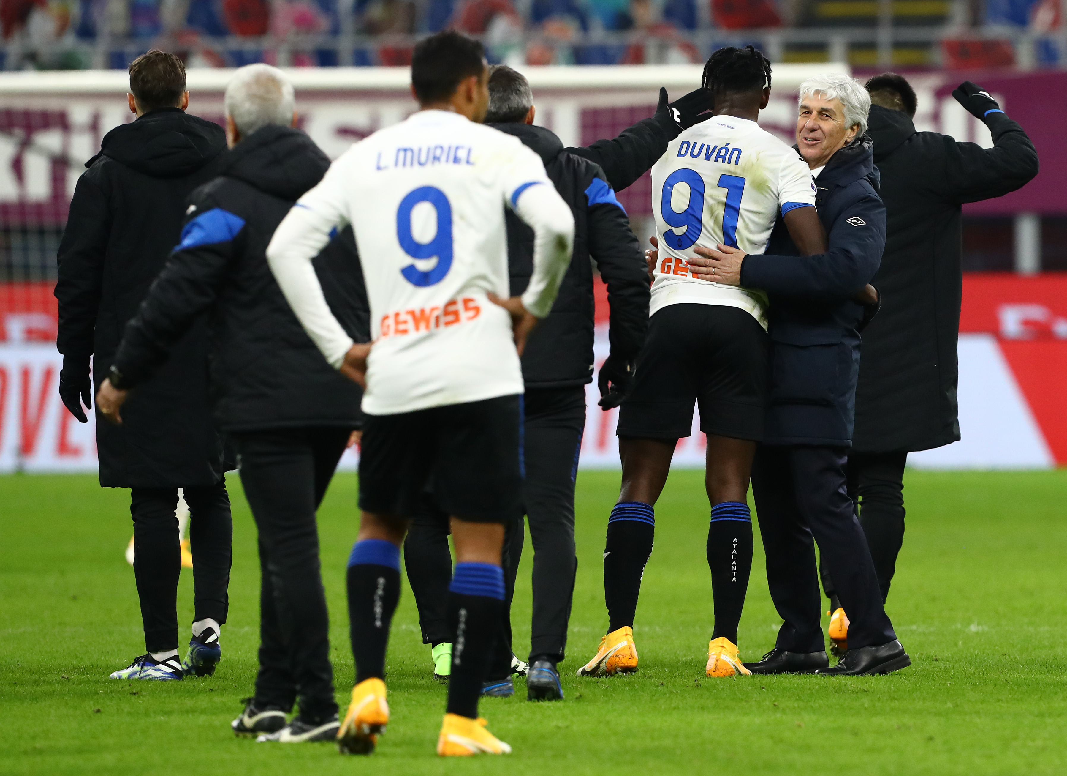 L'Atalanta festeggia dopo la vittoria a San Siro contro il Milan
