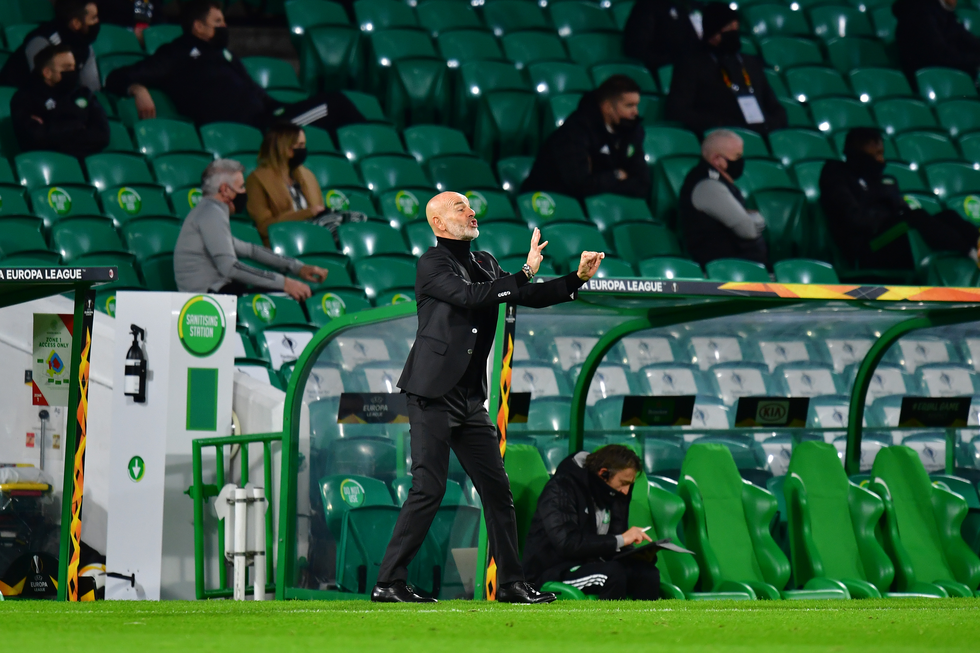 GLASGOW, SCOTLAND - OCTOBER 22: Stefano Pioli, manager of AC Milan gives his team instructions during the UEFA Europa League Group H stage match between Celtic and AC Milan at Celtic Park on October 22, 2020 in Glasgow, Scotland. Sporting stadiums around the UK remain under strict restrictions due to the Coronavirus Pandemic as Government social distancing laws prohibit fans inside venues resulting in games being played behind closed doors. (Photo by Mark Runnacles/Getty Images)