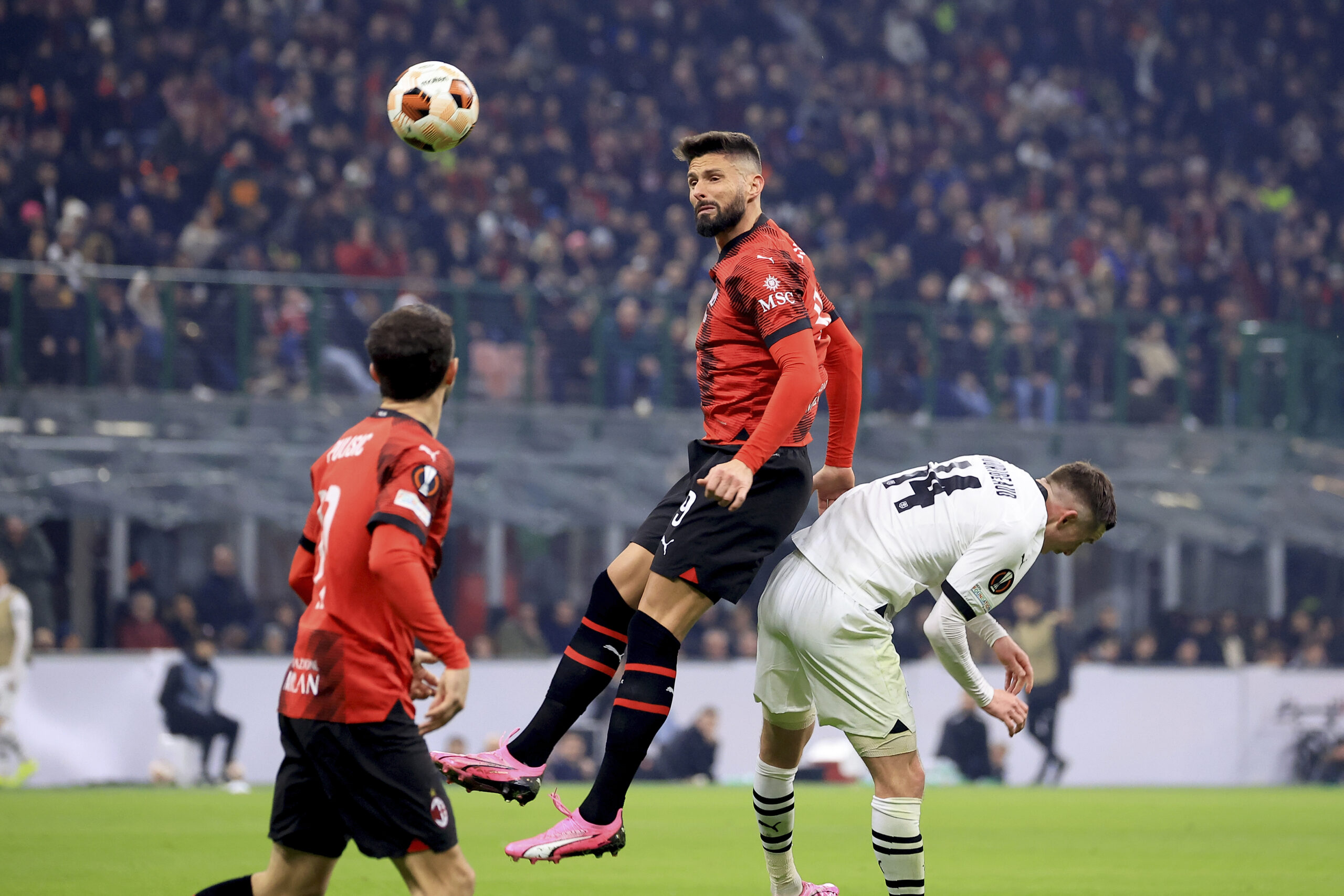 MILAN, ITALY - FEBRUARY 15: Olivier Giroud of AC Milan in action during the UEFA Europa League 2023/24 Playoff first leg match between AC Milan and Stade Rennais FC at Stadio Giuseppe Meazza on February 15, 2024 in Milan, Italy. (Photo by Giuseppe Cottini/AC Milan via Getty Images)