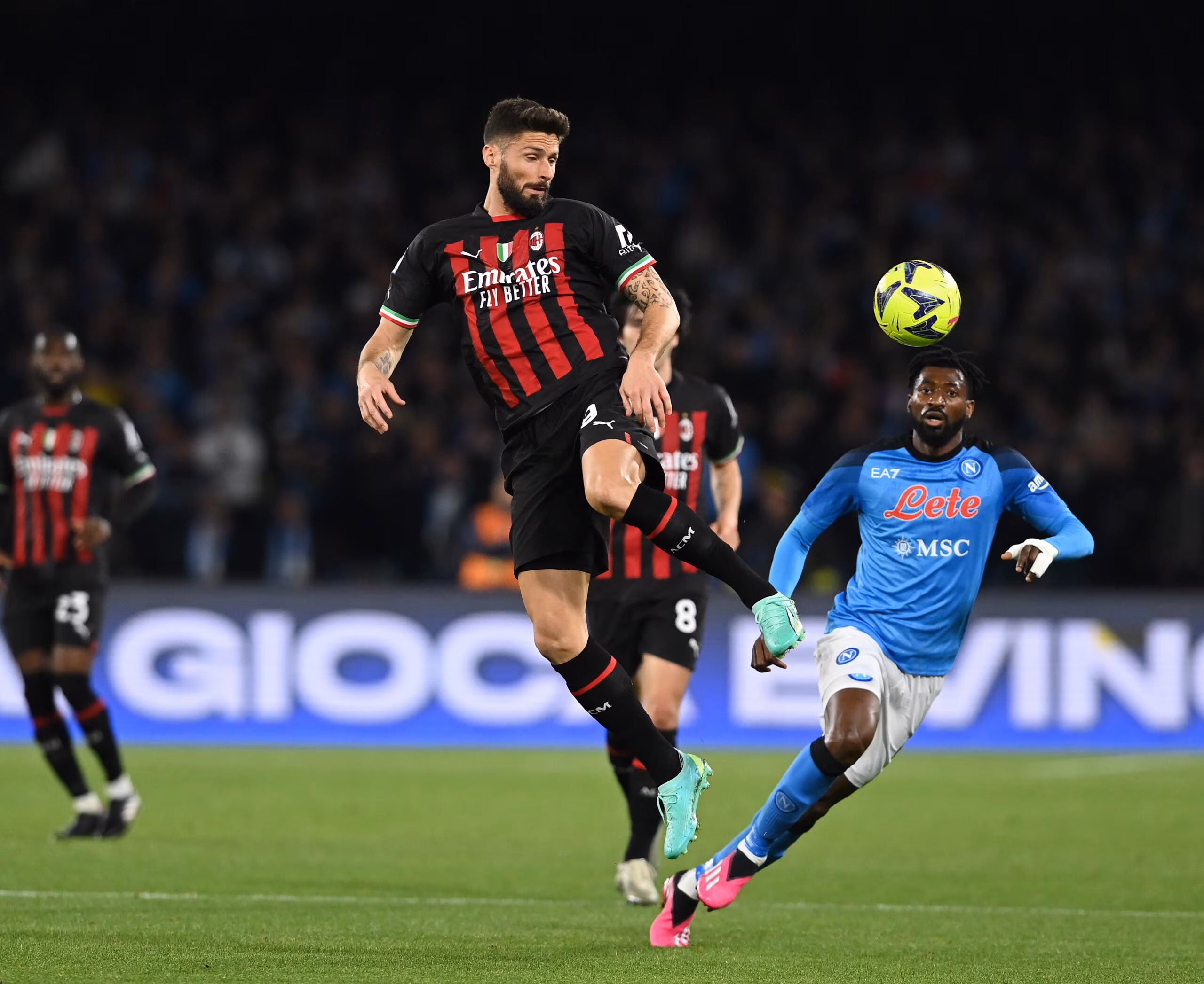 NAPLES, ITALY - APRIL 02: Olivier Giroud of AC Milan in action during the Serie A match between SSC Napoli and AC Milan at Stadio Diego Armando Maradona on April 02, 2023 in Naples, Italy. (Photo by Claudio Villa/AC Milan via Getty Images)