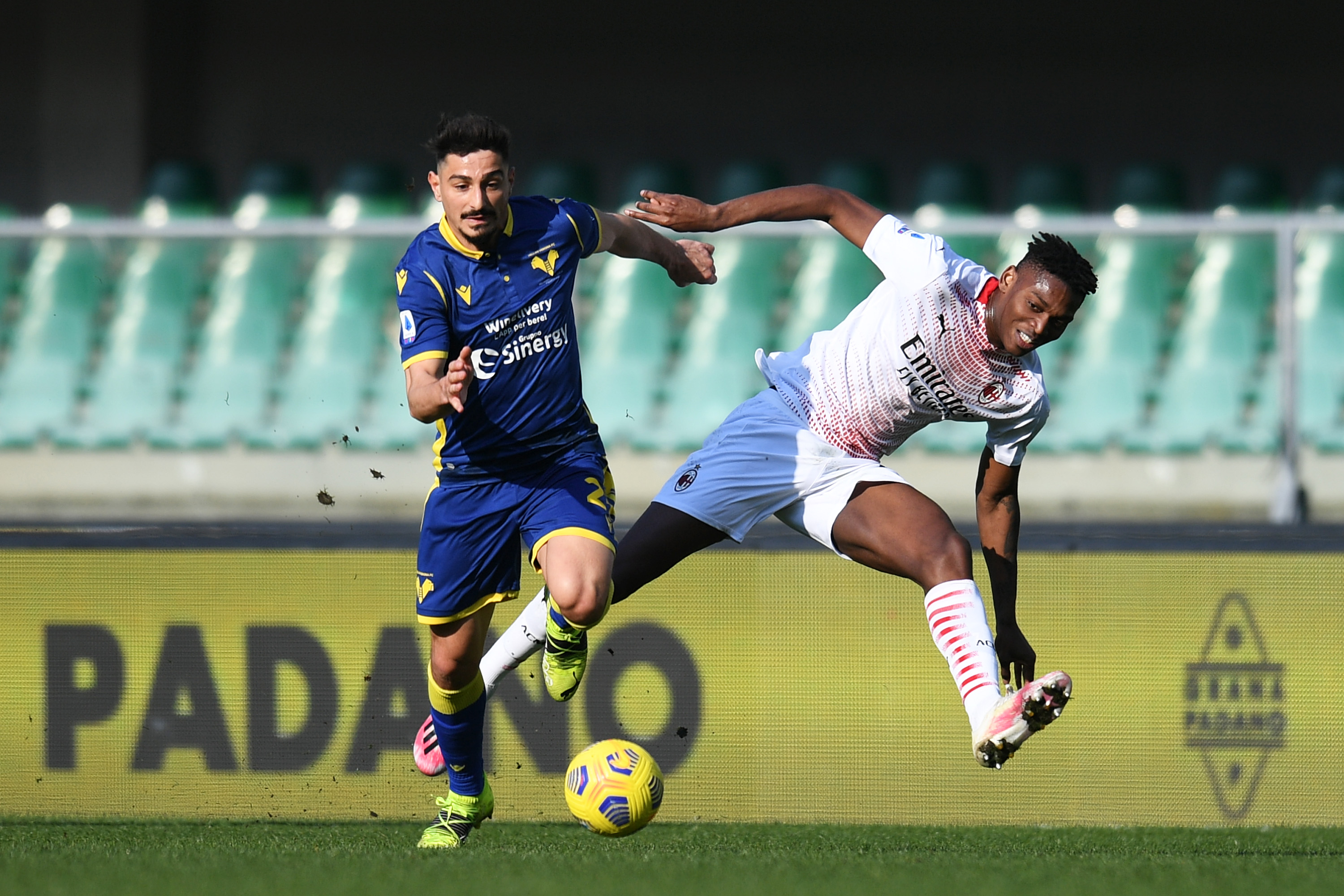 VERONA, ITALY - MARCH 07: Koray Guenter of Hellas Verona and Rafael Leao of A.C. Milan battle for possession during the Serie A match between Hellas Verona FC and AC Milan at Stadio Marcantonio Bentegodi on March 07, 2021 in Verona, Italy. Sporting stadiums around Italy remain under strict restrictions due to the Coronavirus Pandemic as Government social distancing laws prohibit fans inside venues resulting in games being played behind closed doors. (Photo by Alessandro Sabattini/Getty Images)