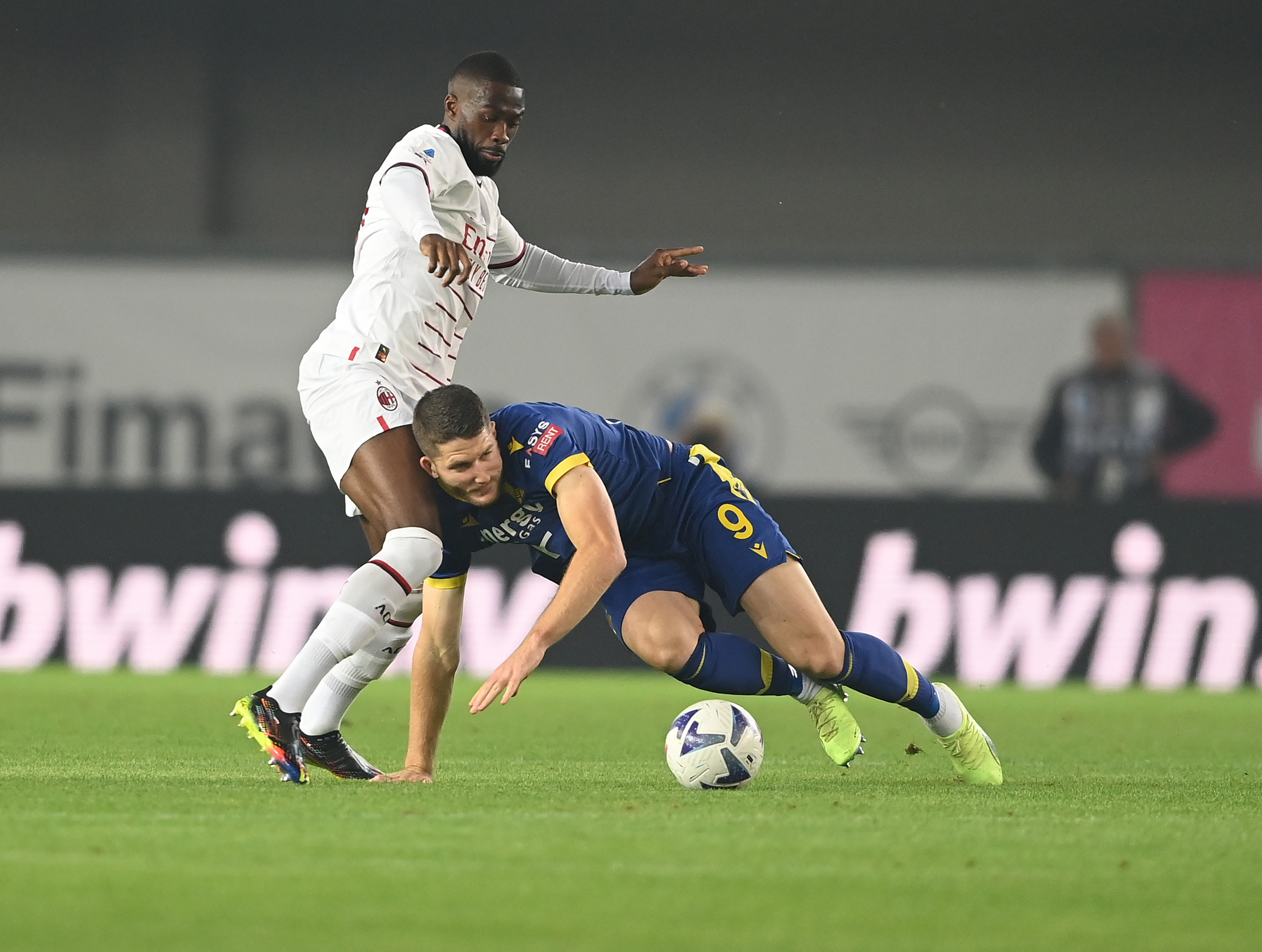 VERONA, ITALY - OCTOBER 16: Fikayo Tomori of AC Milan competes for the ball with Thomas Henry of Hellas Verona during the Serie A match between Hellas Verona and AC MIlan at Stadio Marcantonio Bentegodi on October 16, 2022 in Verona, Italy. (Photo by Claudio Villa/AC Milan via Getty Images)