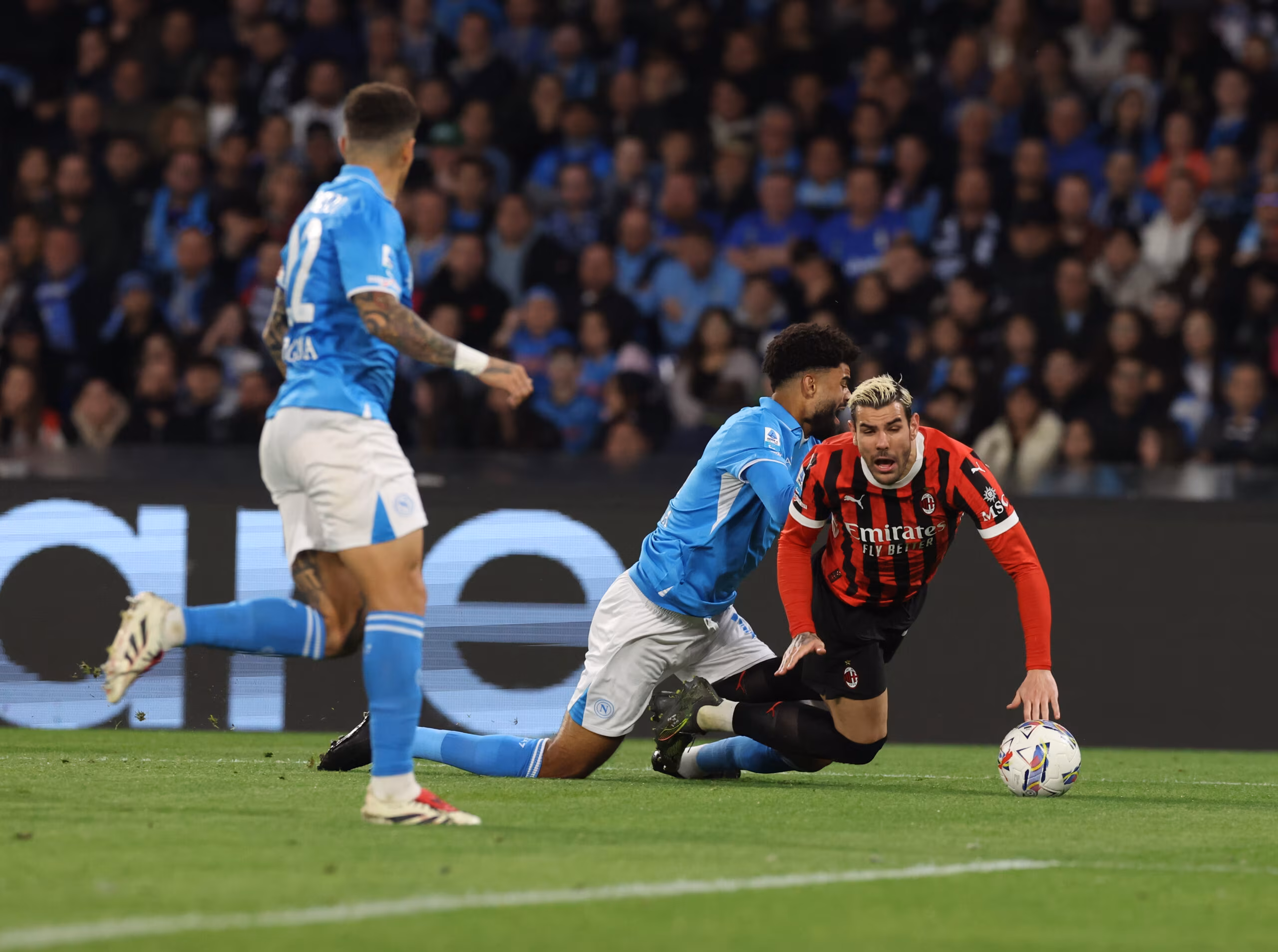 Prima frazione di gioco che si sviluppa in un’unica direzione. Il Napoli domina i rossoneri in lungo e in largo, approfittandone di due errori difensivi. Prima Politano che aggancia il pallone su un lancio lungo a scavalcare Theo e Pavlovic, arriva in porta e fulmina Maignan con il mancino. Poco dopo arriva il raddoppio di Lukaku che, dopo un’imbucata di Gilmour, stoppa la palla e solo davanti il portiere insacca con un tiro ad incrociare.