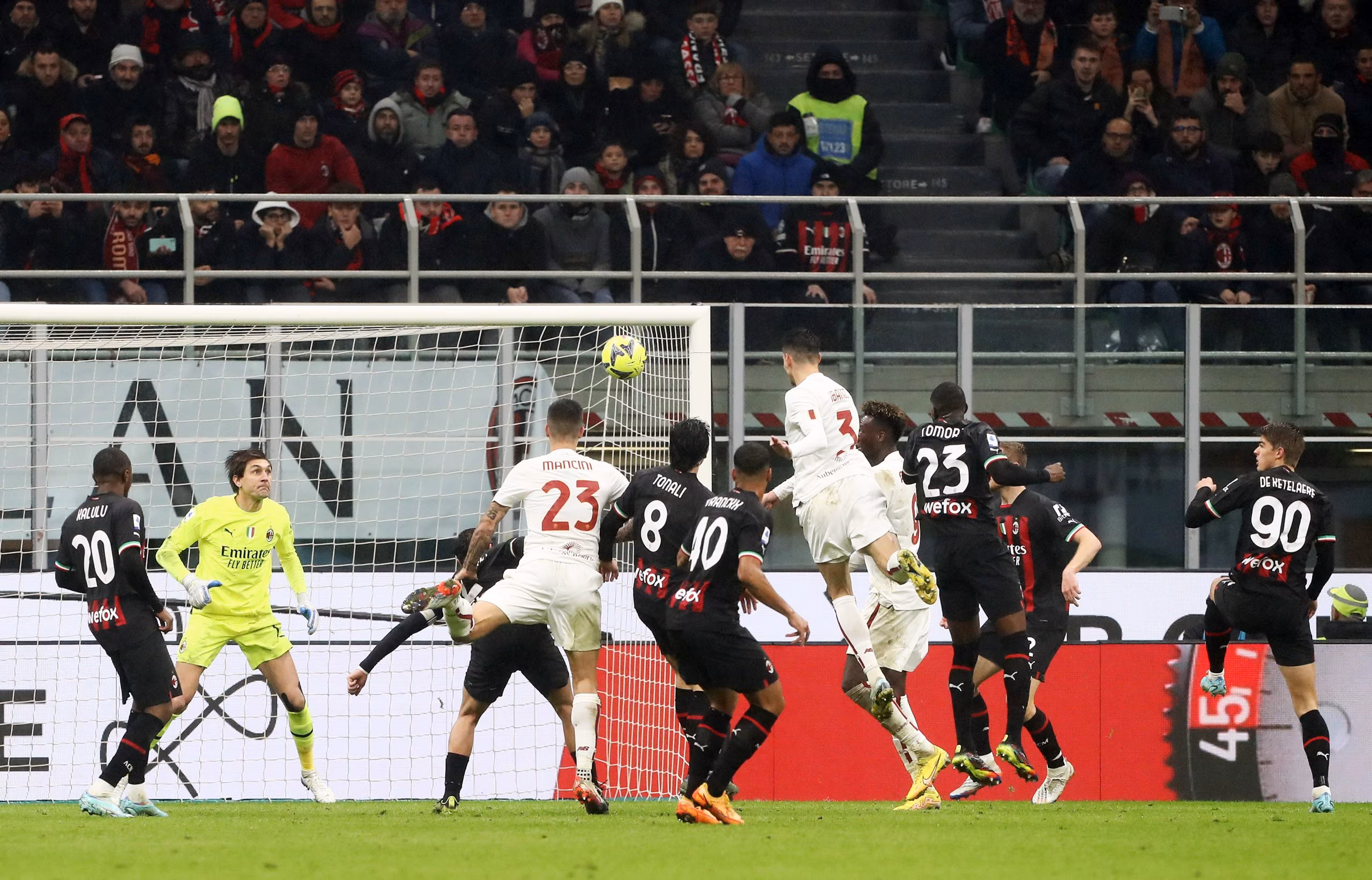 MILAN, ITALY - JANUARY 08: Roger Ibanez of AS Roma scores the team's first goal during the Serie A match between AC Milan and AS Roma at Stadio Giuseppe Meazza on January 08, 2023 in Milan, Italy. (Photo by Marco Luzzani/Getty Images)