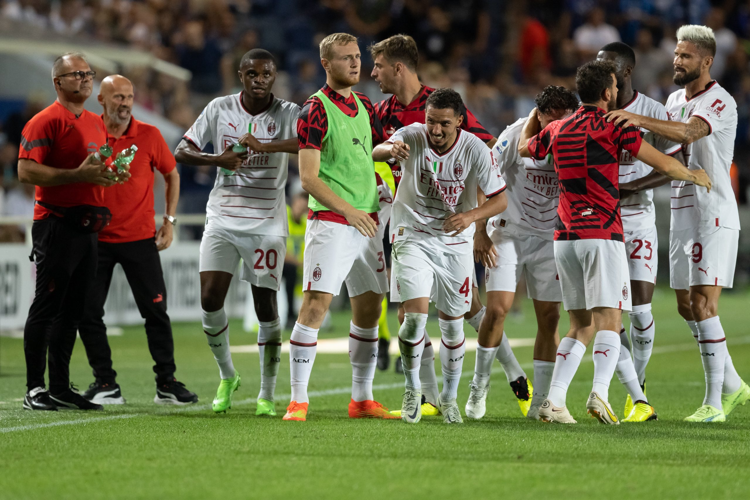 BERGAMO, ITALY - AUGUST 21: Ismael Bennacer of AC Milan celebrates with teammates after scoring his team's first goal during the Serie A match between Atalanta BC and AC Milan at Gewiss Stadium on August 21, 2022 in Bergamo, Italy. (Photo by Emmanuele Ciancaglini/Ciancaphoto Studio/Getty Images)