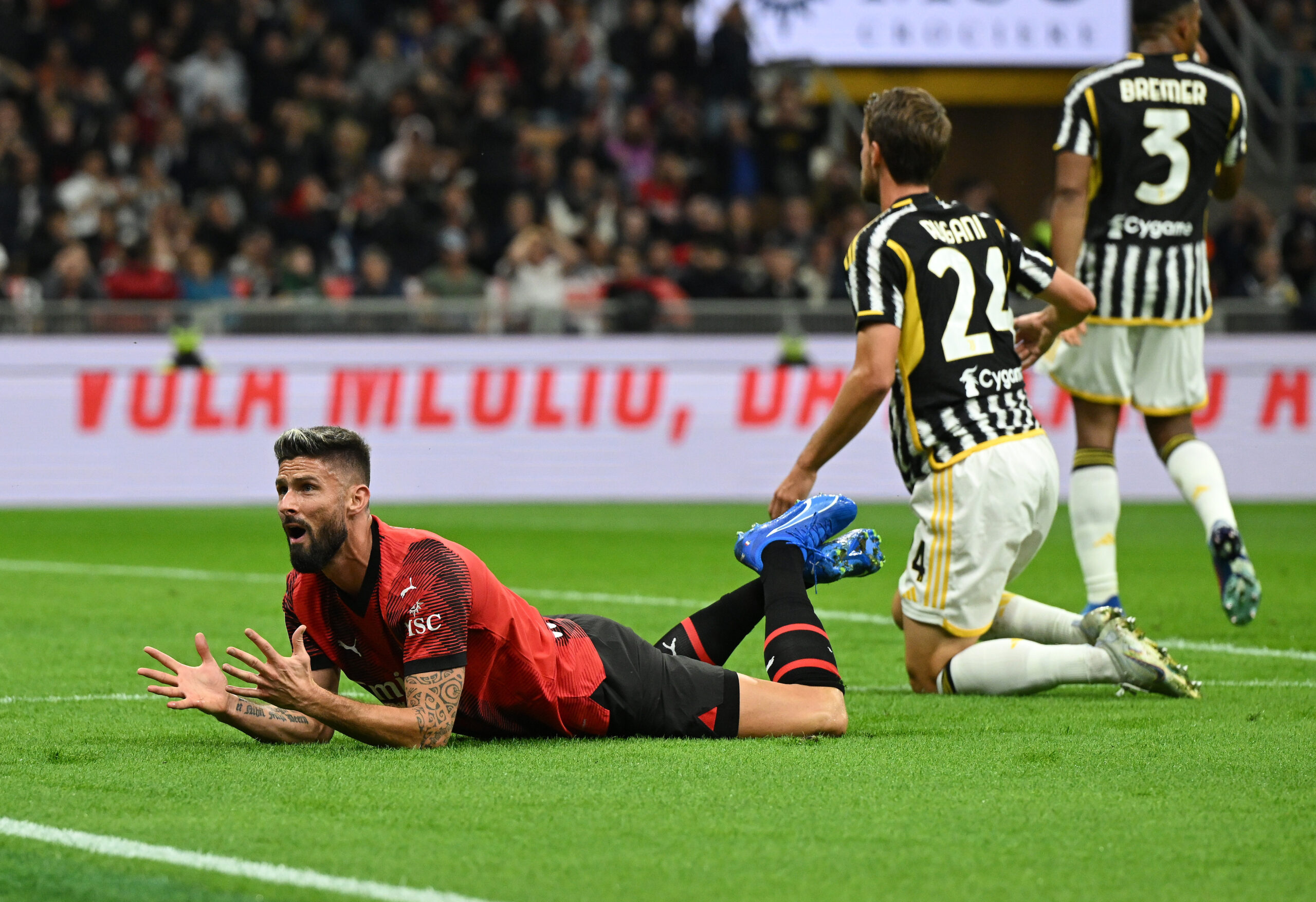 MILAN, ITALY - OCTOBER 22: Olivier Giroud of AC Milan reacts during the Serie A TIM match between AC Milan and Juventus at Stadio Giuseppe Meazza on October 22, 2023 in Milan, Italy. (Photo by Claudio Villa/AC Milan via Getty Images)