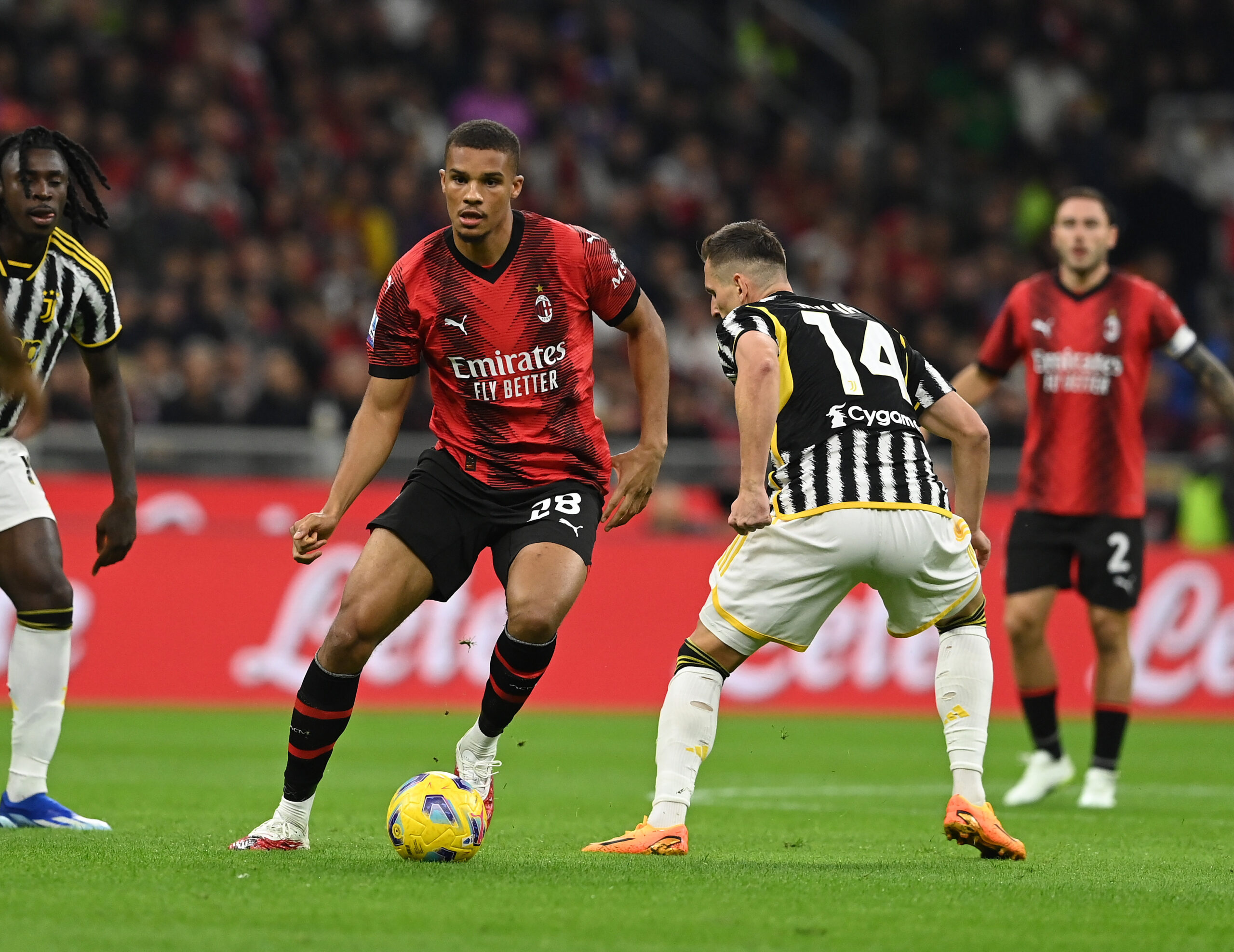 MILAN, ITALY - OCTOBER 22: Malick Thiaw of AC Milan competes for the ball with Arkadiusz Milik of Juventus the Serie A TIM match between AC Milan and Juventus at Stadio Giuseppe Meazza on October 22, 2023 in Milan, Italy. (Photo by Claudio Villa/AC Milan via Getty Images)