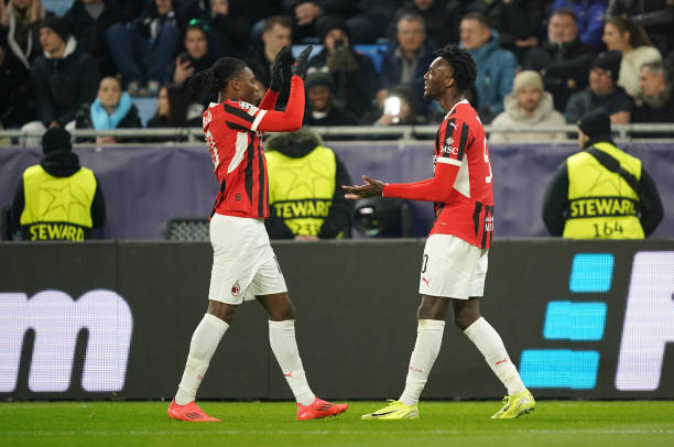 BRATISLAVA, SLOVAKIA - NOVEMBER 26: Tammy Abraham of AC Milan celebrates scoring his team's third goal with teammate Rafael Leao during the UEFA Champions League 2024/25 League Phase MD5 match between SK Slovan Bratislava and AC Milan at Narodny Futbalovy Stadion on November 26, 2024 in Bratislava, Slovakia. (Photo by Christian Hofer/Getty Images)