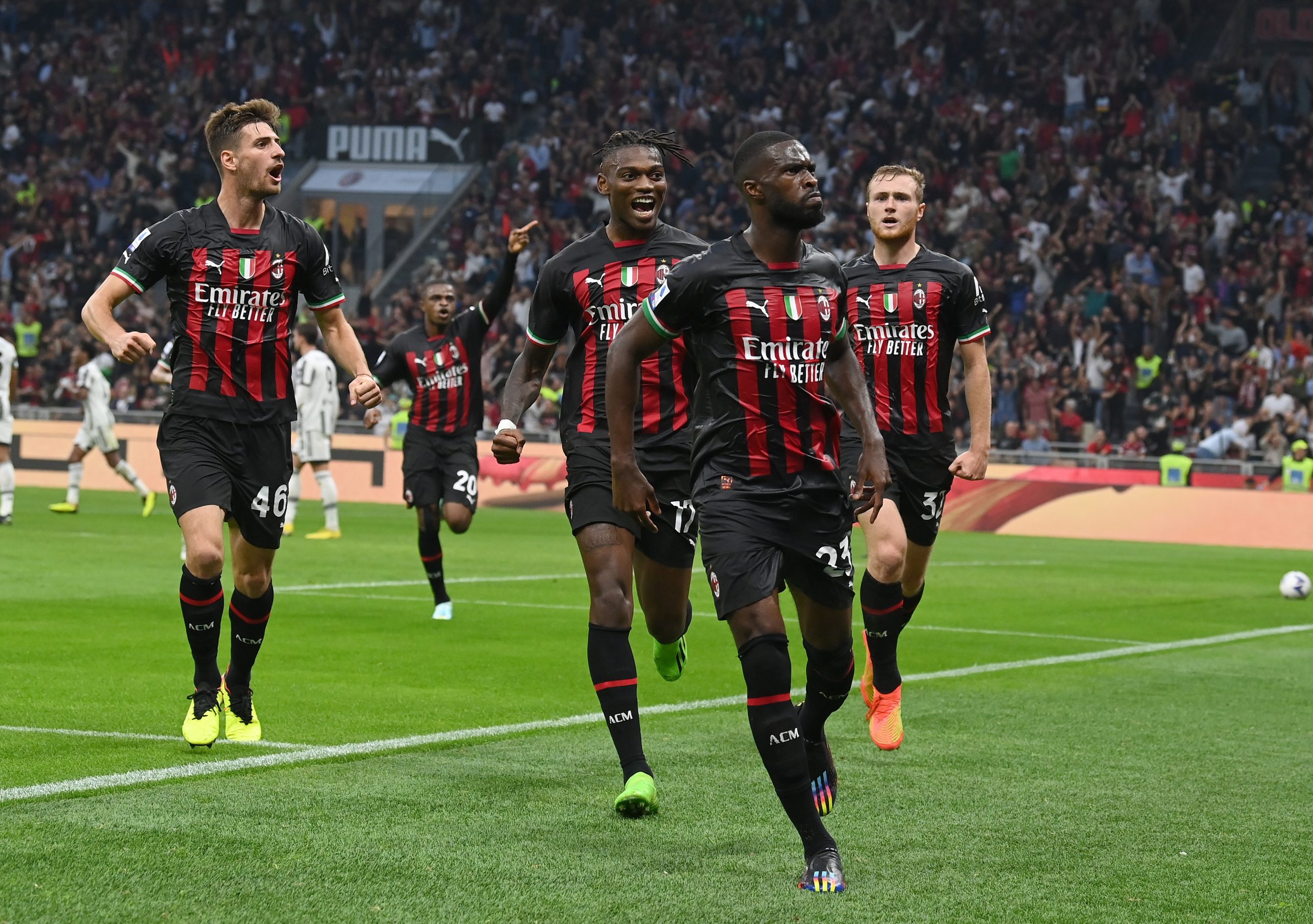 MILAN, ITALY - OCTOBER 08: Fikayo Tomori of AC Milan celebrates with team-mates after scoring the opening goal during the Serie A match between AC Milan and Juventus at Stadio Giuseppe Meazza on October 08, 2022 in Milan, Italy. (Photo by Claudio Villa/AC Milan via Getty Images)