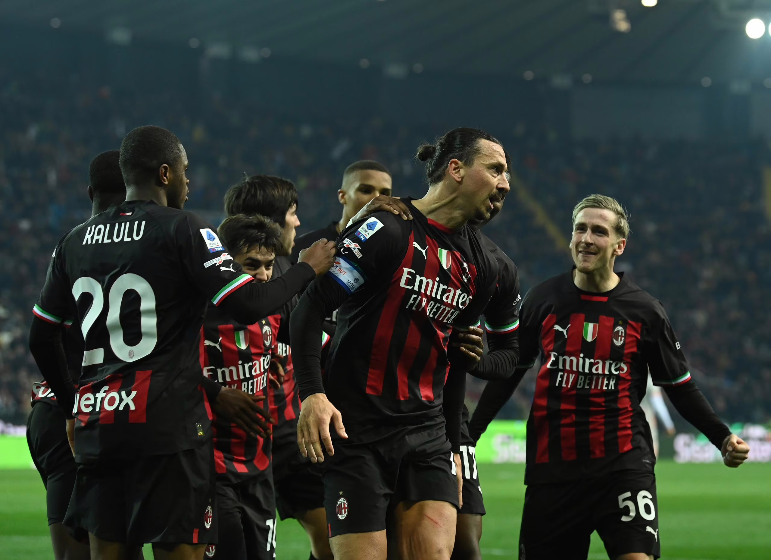UDINE, ITALY - MARCH 18: Zlatan Ibrahimovic of AC Milan celebrates with team-mates after scoring the goal during the Serie A match between Udinese Calcio and AC Milan at Dacia Arena on March 18, 2023 in Udine, Italy. (Photo by Claudio Villa/AC Milan via Getty Images)