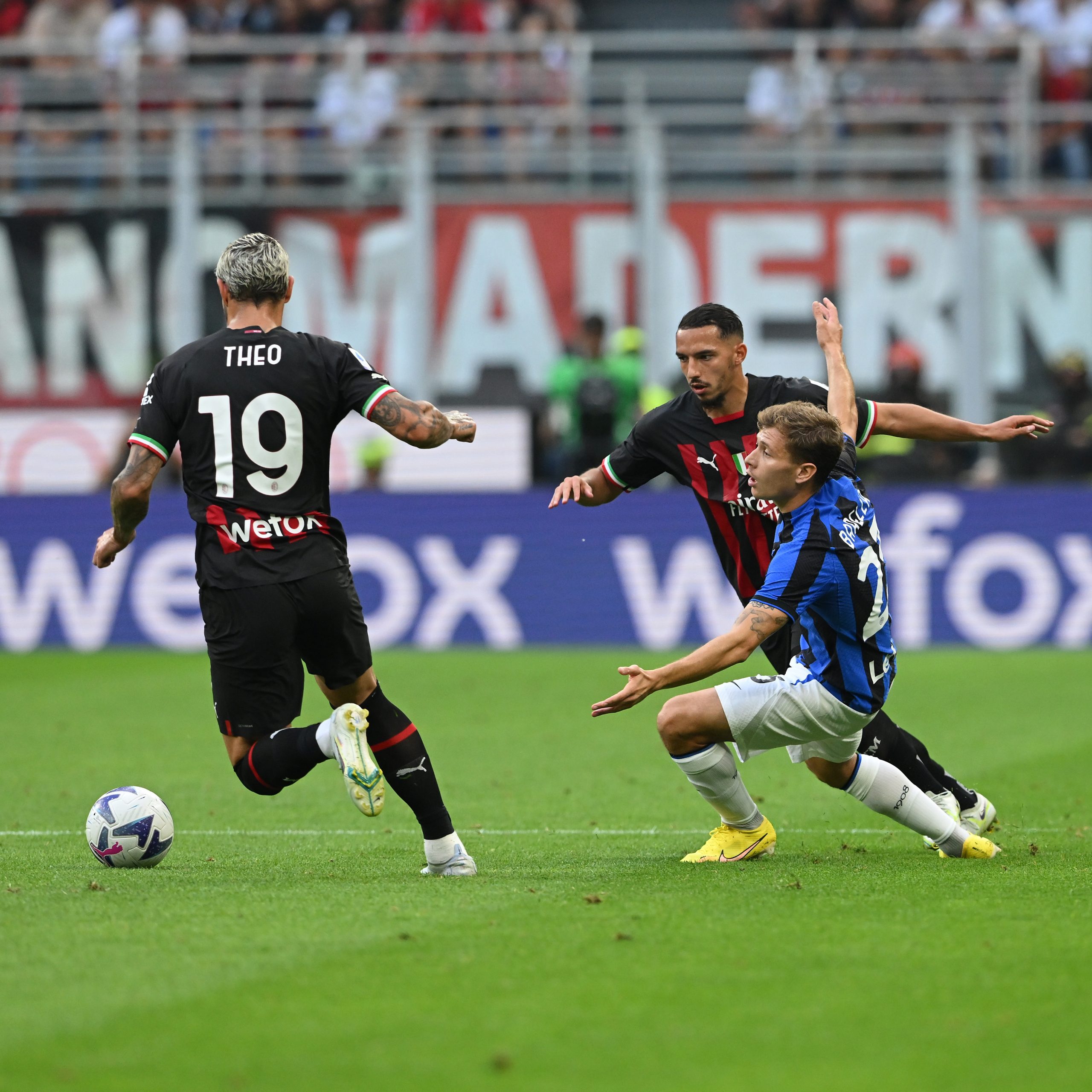 MILAN, ITALY - SEPTEMBER 03: Theo Hernandez and Ismael Bennacer of AC Milan competes for the ball with Nicolo Barella of FC Internazionale during the Serie A match between AC Milan and FC Internazionale at Stadio Giuseppe Meazza on September 03, 2022 in Milan, Italy. (Photo by Claudio Villa/AC Milan via Getty Images)
