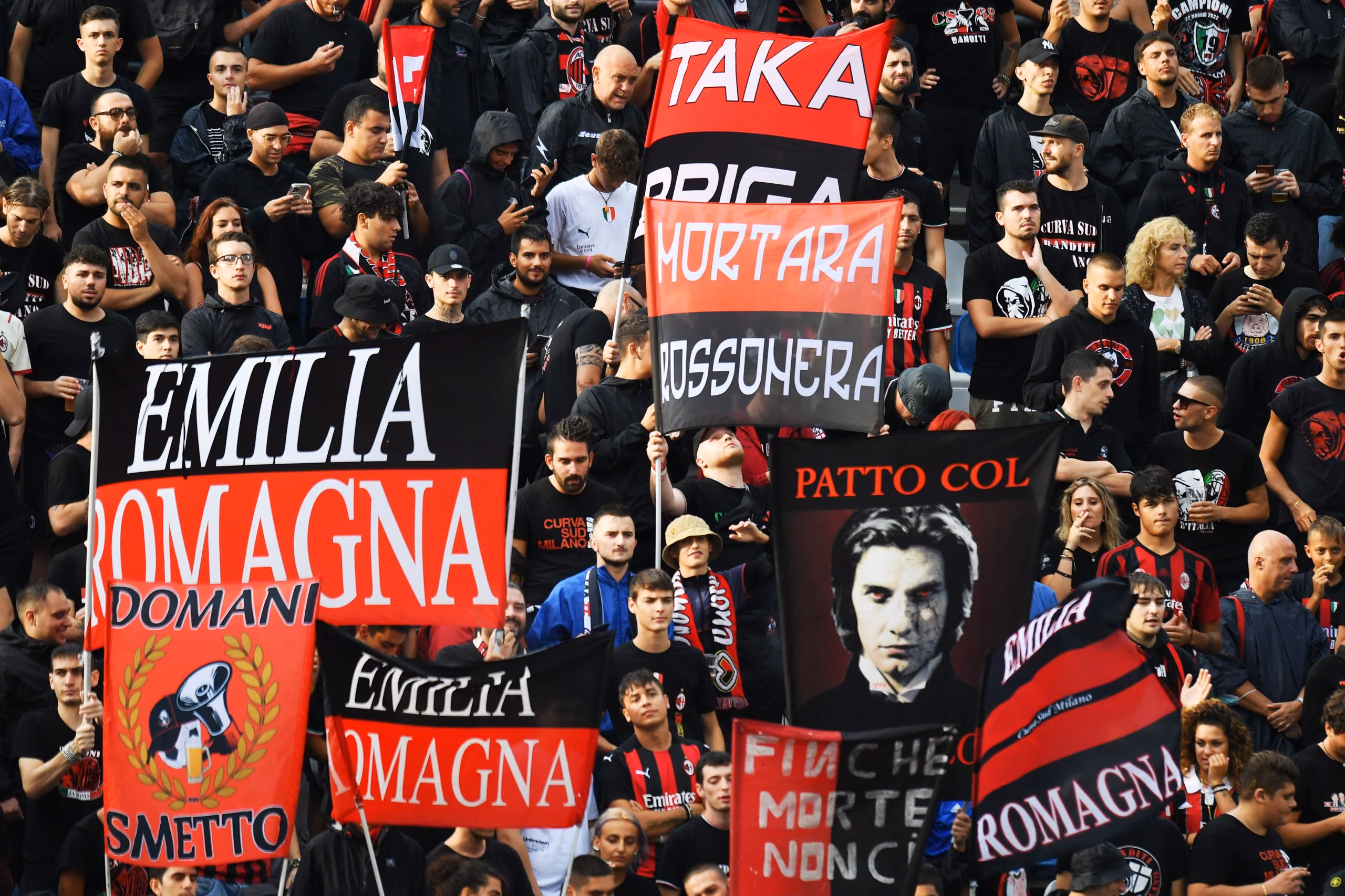 REGGIO NELL'EMILIA, ITALY - AUGUST 30: AC Milan fans hold up banners prior to the Serie A match between US Sassuolo and AC MIlan at Mapei Stadium - Citta' del Tricolore on August 30, 2022 in Reggio nell'Emilia, Italy. (Photo by Alessandro Sabattini/Getty Images)