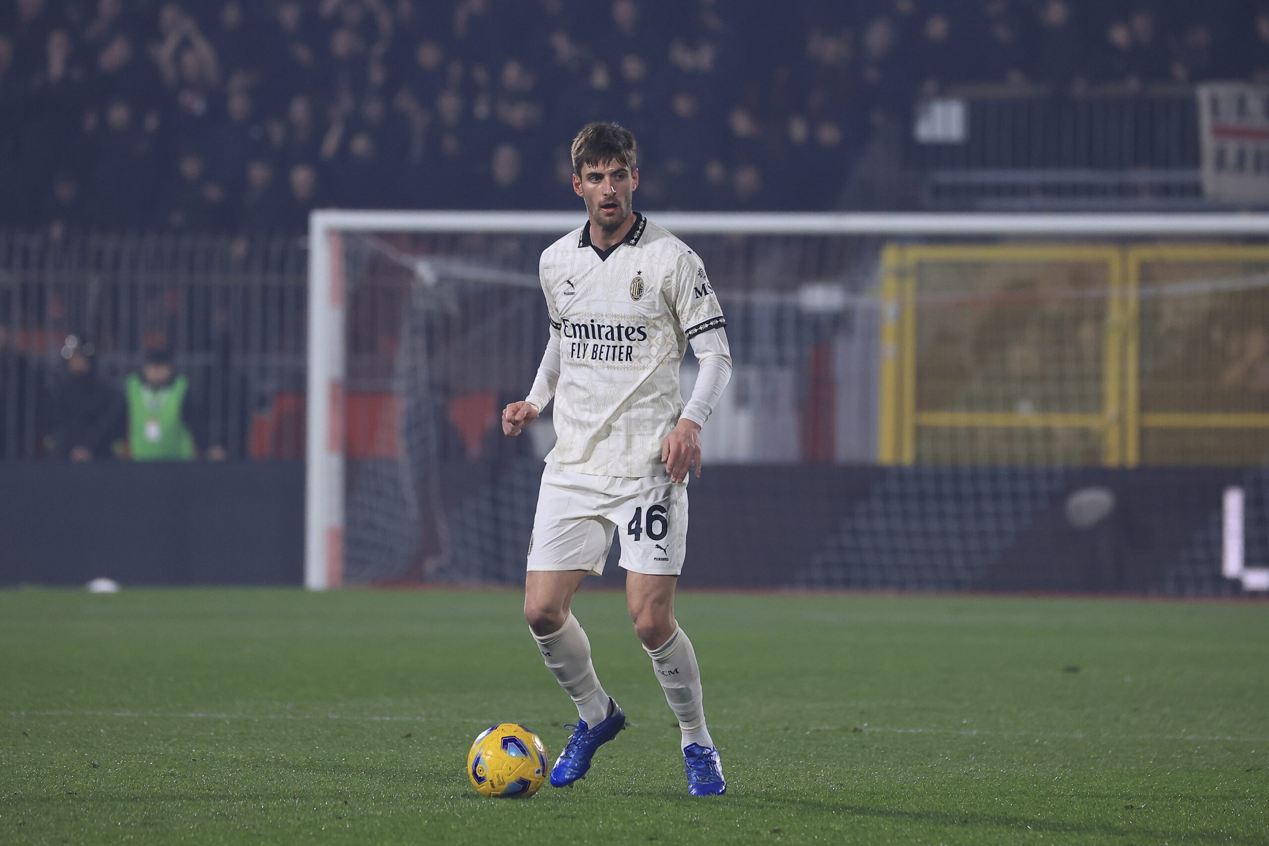 MONZA, ITALY - FEBRUARY 18: Matteo Gabbia of AC Milan in action during the Serie A TIM match between AC Monza and AC Milan at U-Power Stadium on February 18, 2024 in Monza, Italy. (Photo by Giuseppe Cottini/AC Milan via Getty Images)