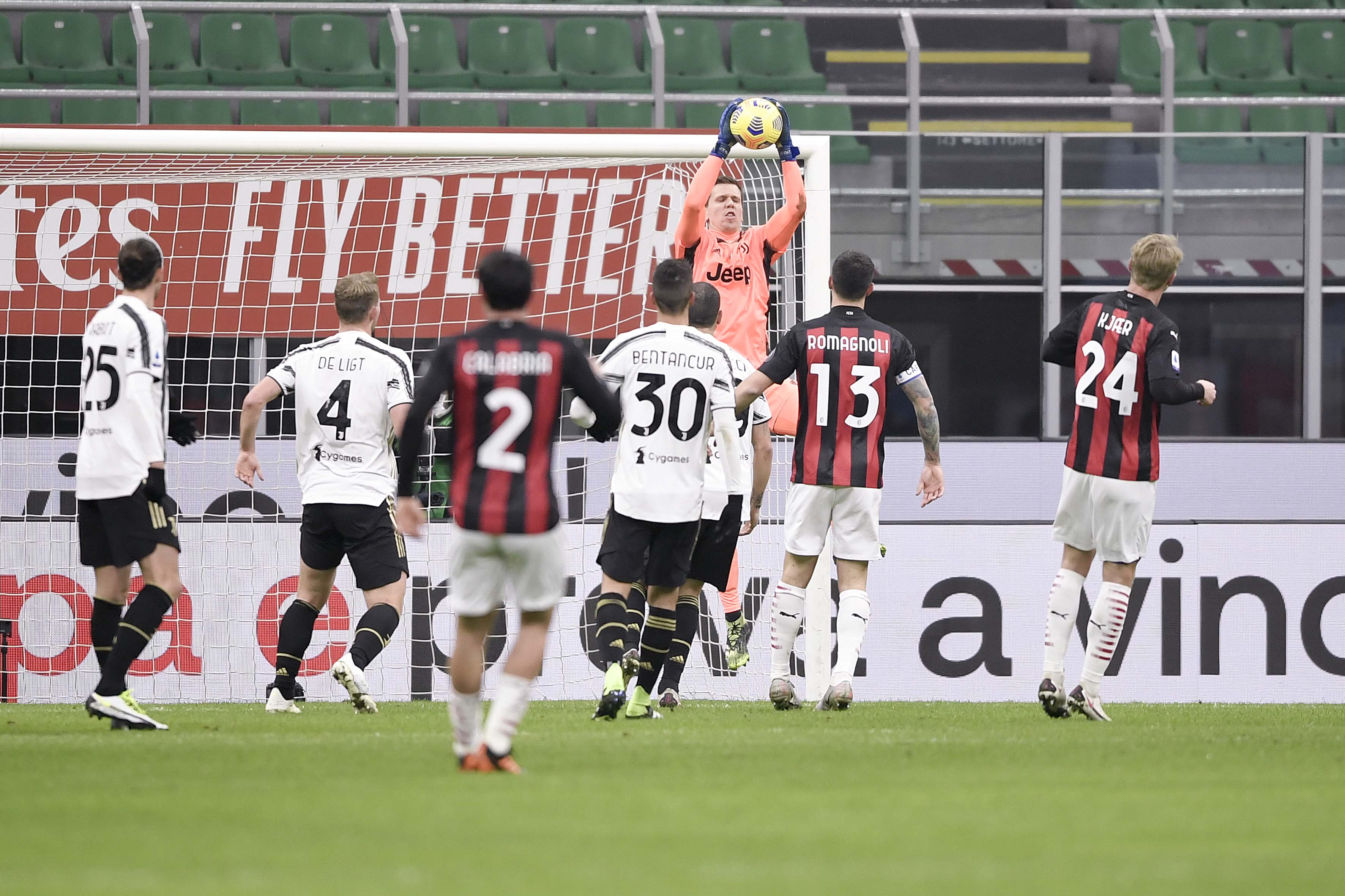 MILAN, ITALY - JANUARY 06: Juventus' goalkeeper Wojciech Szczesny saves the ball during the Serie A match between AC Milan and Juventus at Stadio Giuseppe Meazza on January 06, 2021 in Milan, Italy. Sporting stadiums around Italy remain under strict restrictions due to the Coronavirus Pandemic as Government social distancing laws prohibit fans inside venues resulting in games being played behind closed doors. (Photo by Daniele Badolato - Juventus FC/Juventus FC via Getty Images)