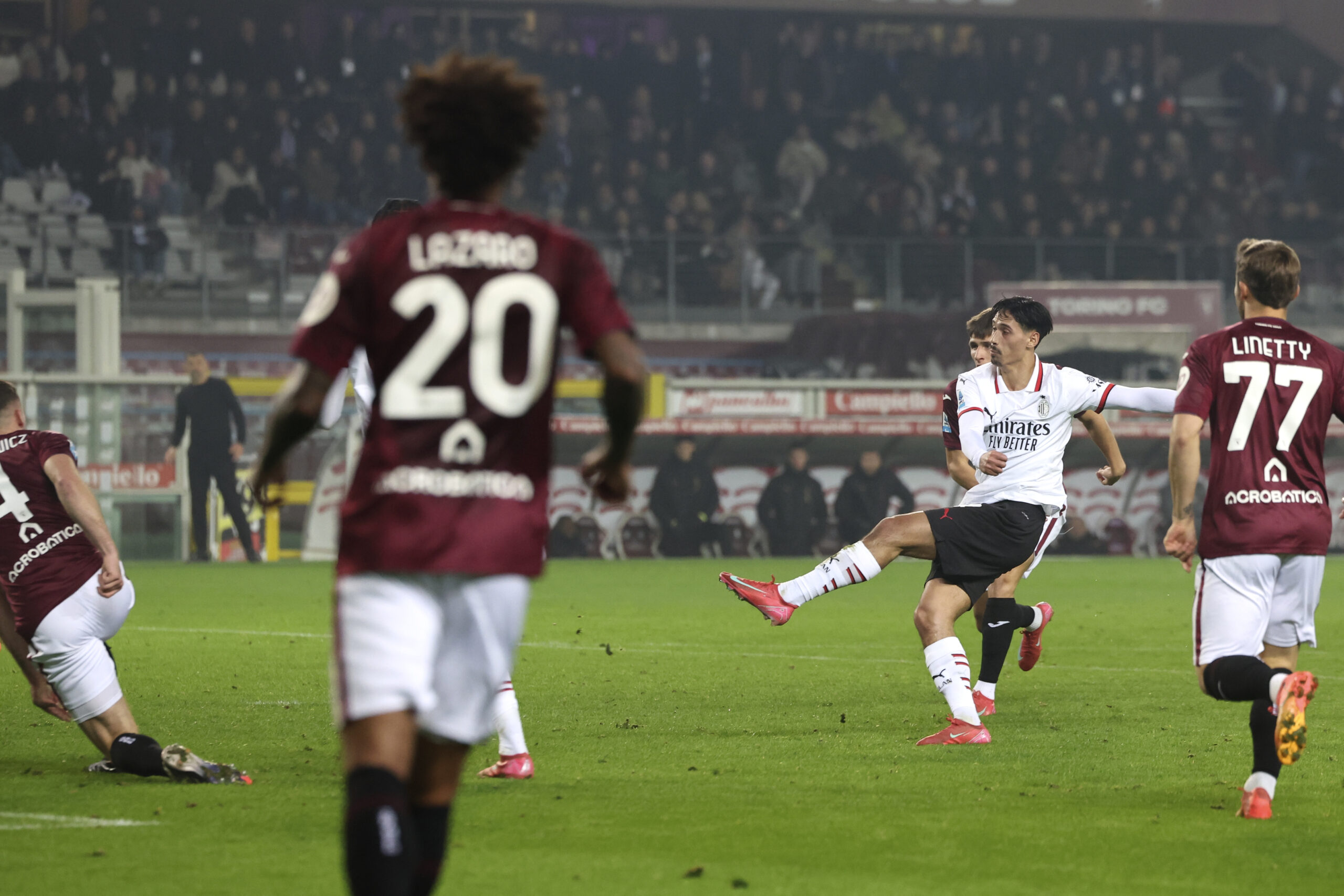 TURIN, ITALY - FEBRUARY 22: Tijjani Reijnders of AC Milan scores his team's equalizing goal during the Serie A match between Torino and AC Milan at Stadio Olimpico di Torino on February 22, 2025 in Turin, Italy. (Photo by Claudio Villa/AC Milan via Getty Images)