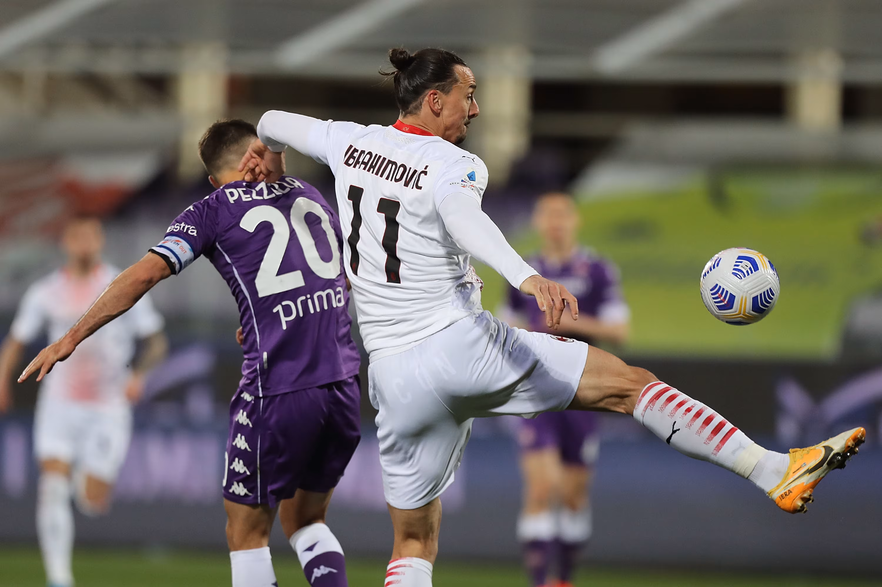 FLORENCE, ITALY - MARCH 21: Zlatan Ibrahimovic of AC Milan in action against German Pezzella of ACF Fiorentina during the Serie A match between ACF Fiorentina and AC Milan at Stadio Artemio Franchi on March 21, 2021 in Florence, Italy. (Photo by Gabriele Maltinti/Getty Images)