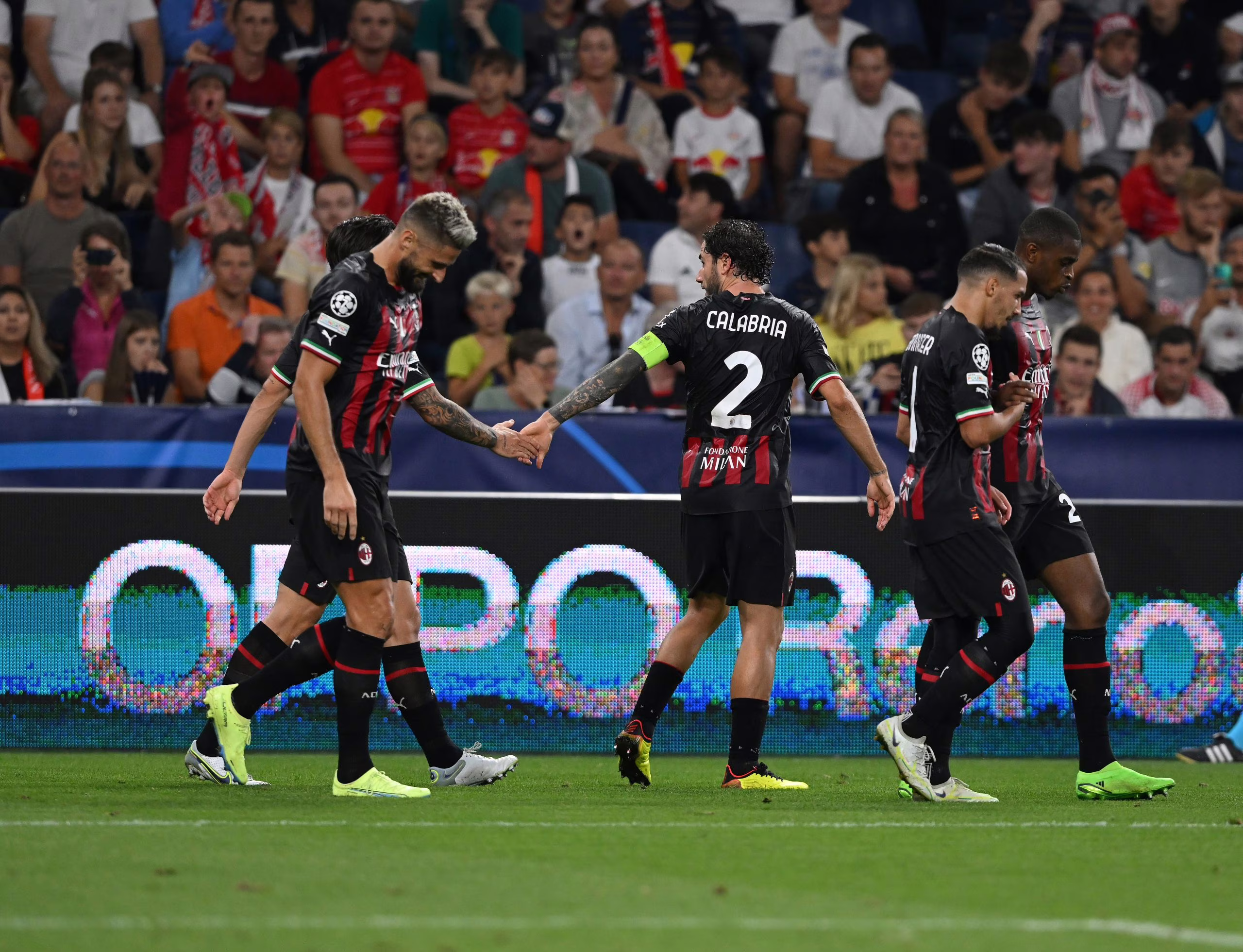 SALZBURG, AUSTRIA - SEPTEMBER 06: Alexis Saelemaekers of AC Milan celebrataes with team-mates after scoring the goal during the UEFA Champions League group E match between FC Salzburg and AC Milan at Football Arena Salzburg on September 06, 2022 in Salzburg, Austria. (Photo by Claudio Villa/AC Milan via Getty Images)