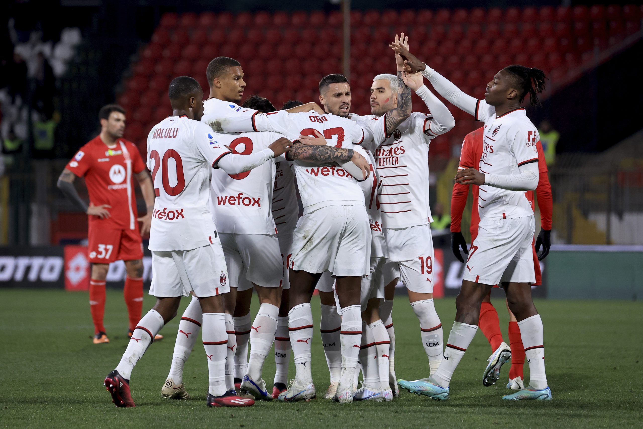 MONZA, ITALY - FEBRUARY 18: Junior Messias of AC Milan celebrates his goal with his team-mates during the Serie A match between AC Monza and AC Milan at Stadio Brianteo on February 18, 2023 in Monza, Italy. (Photo by Giuseppe Cottini/Getty Images)