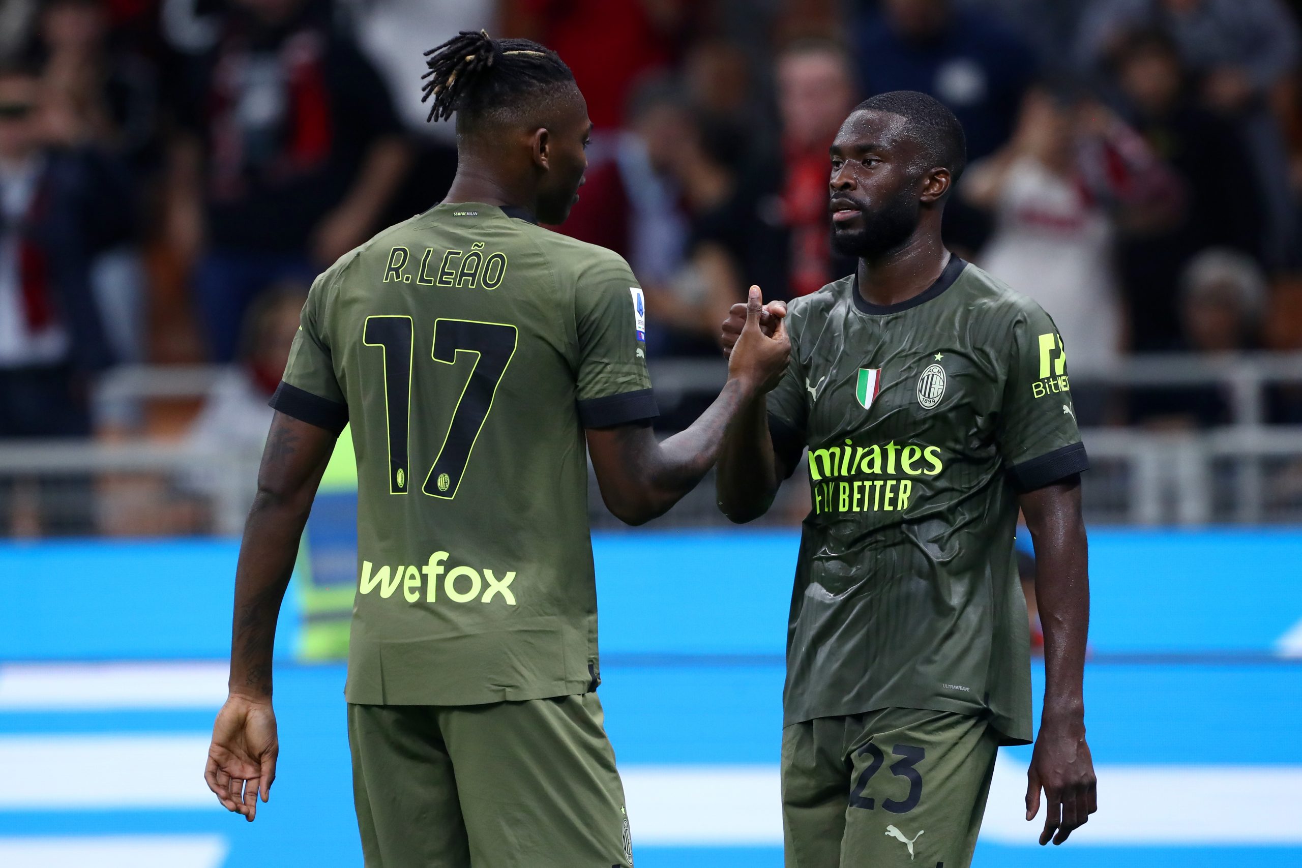 MILAN, ITALY - OCTOBER 22: Rafael Leao celebrates with Fikayo Tomori of AC Milan after scoring their team's fourth goal during the Serie A match between AC Milan and AC Monza at Stadio Giuseppe Meazza on October 22, 2022 in Milan, Italy. (Photo by Marco Luzzani/Getty Images)